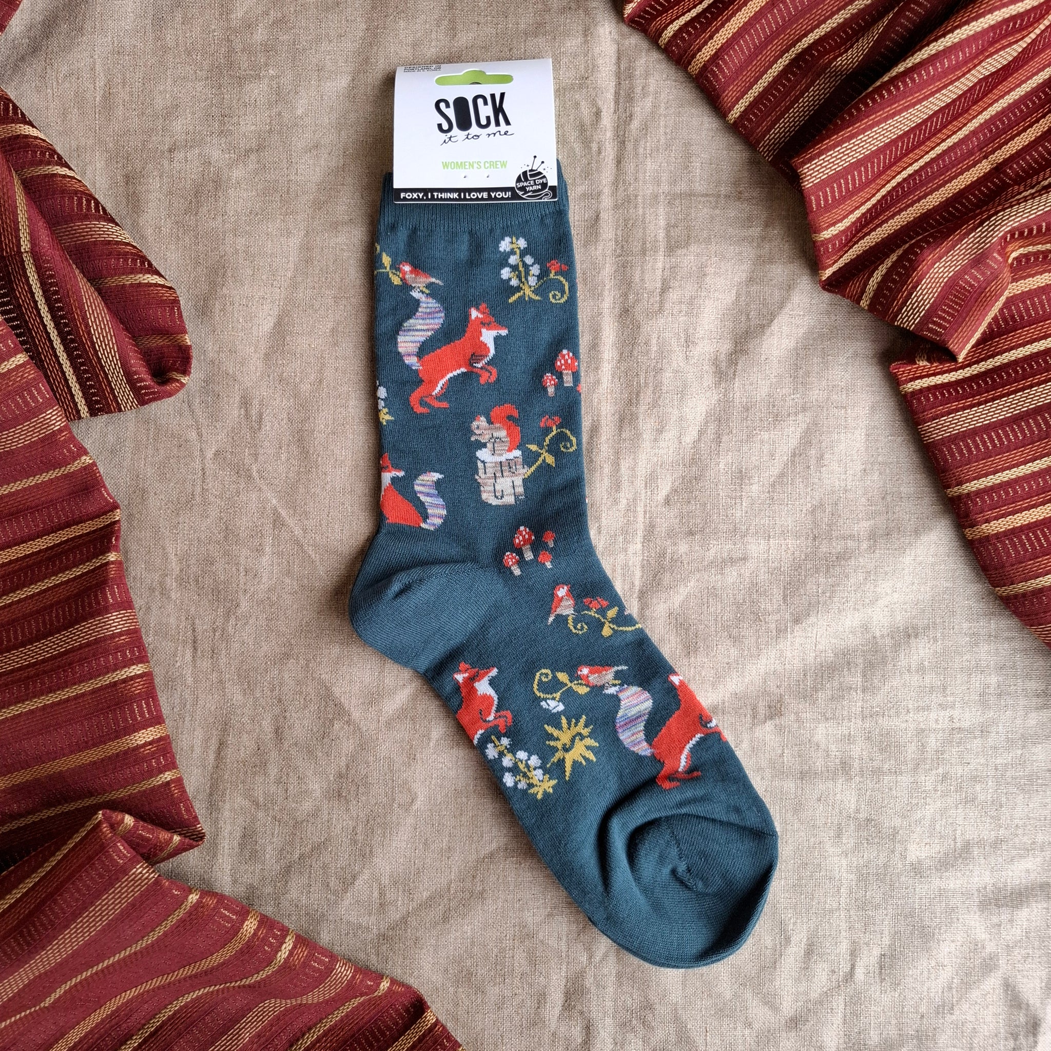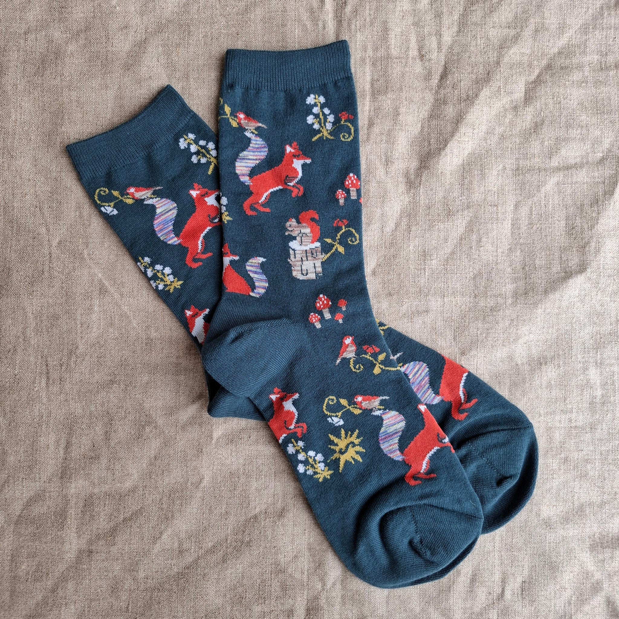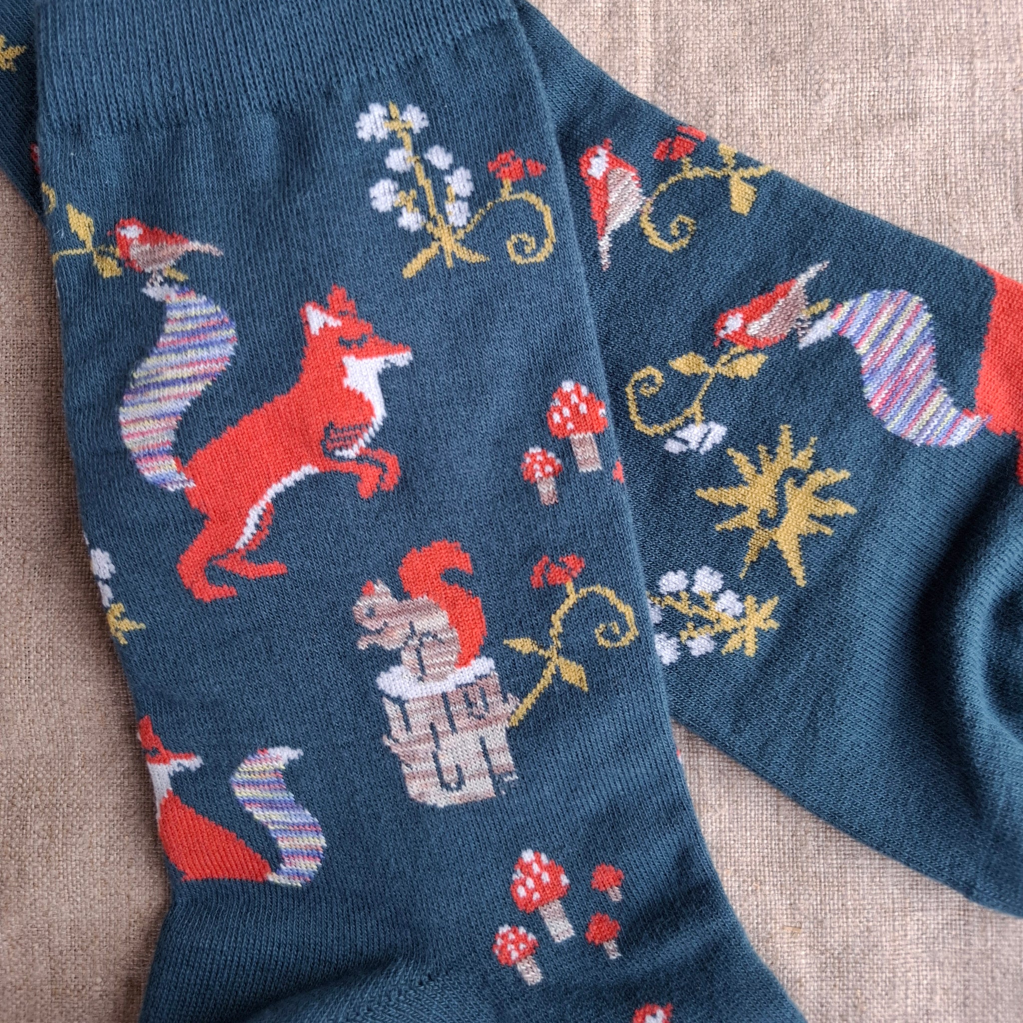 Dark teal socks with a forest scene featuring bright red foxes, squirrels, birds, and mushrooms.