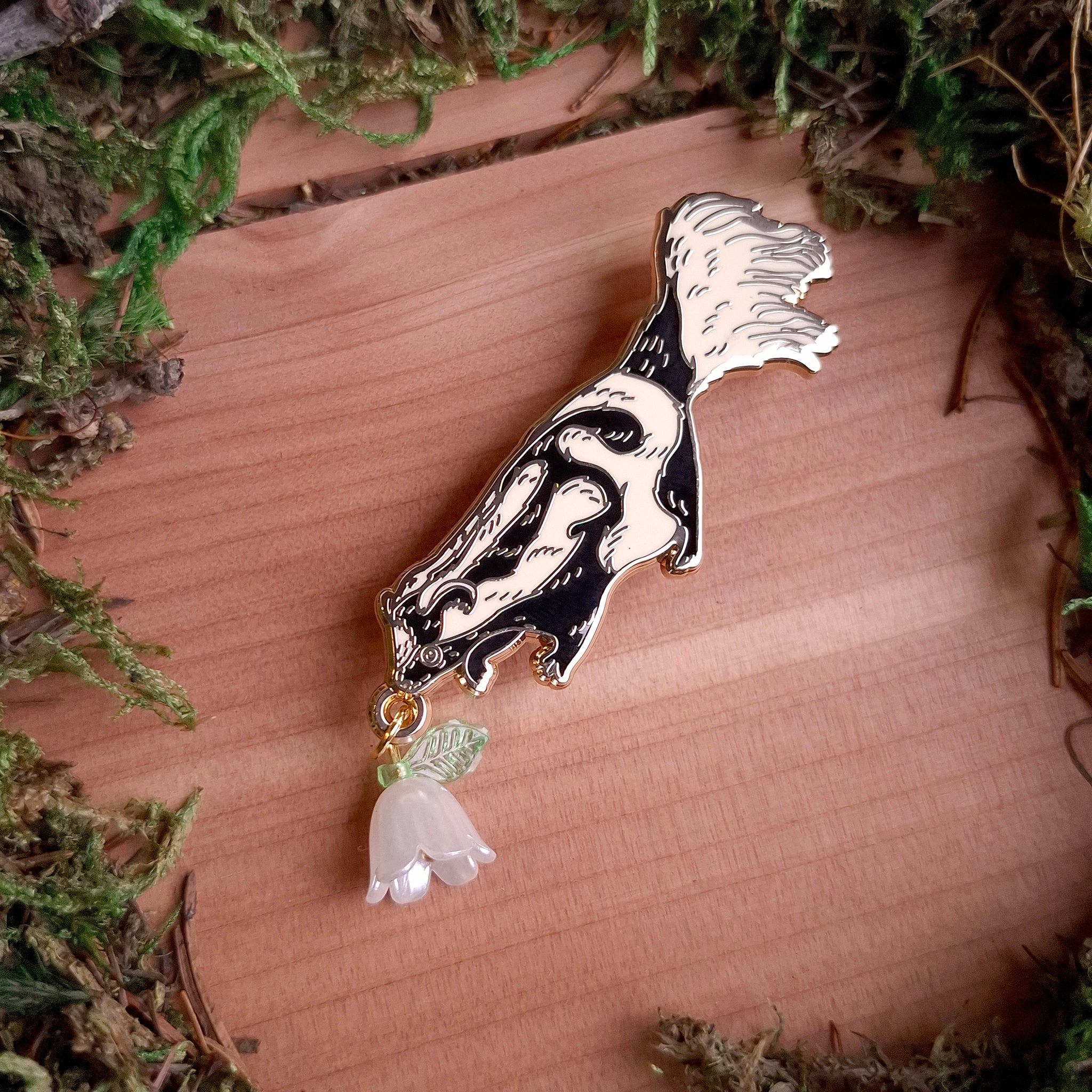 An enamel pin of a spotted skunk, holding a little white flower charm.