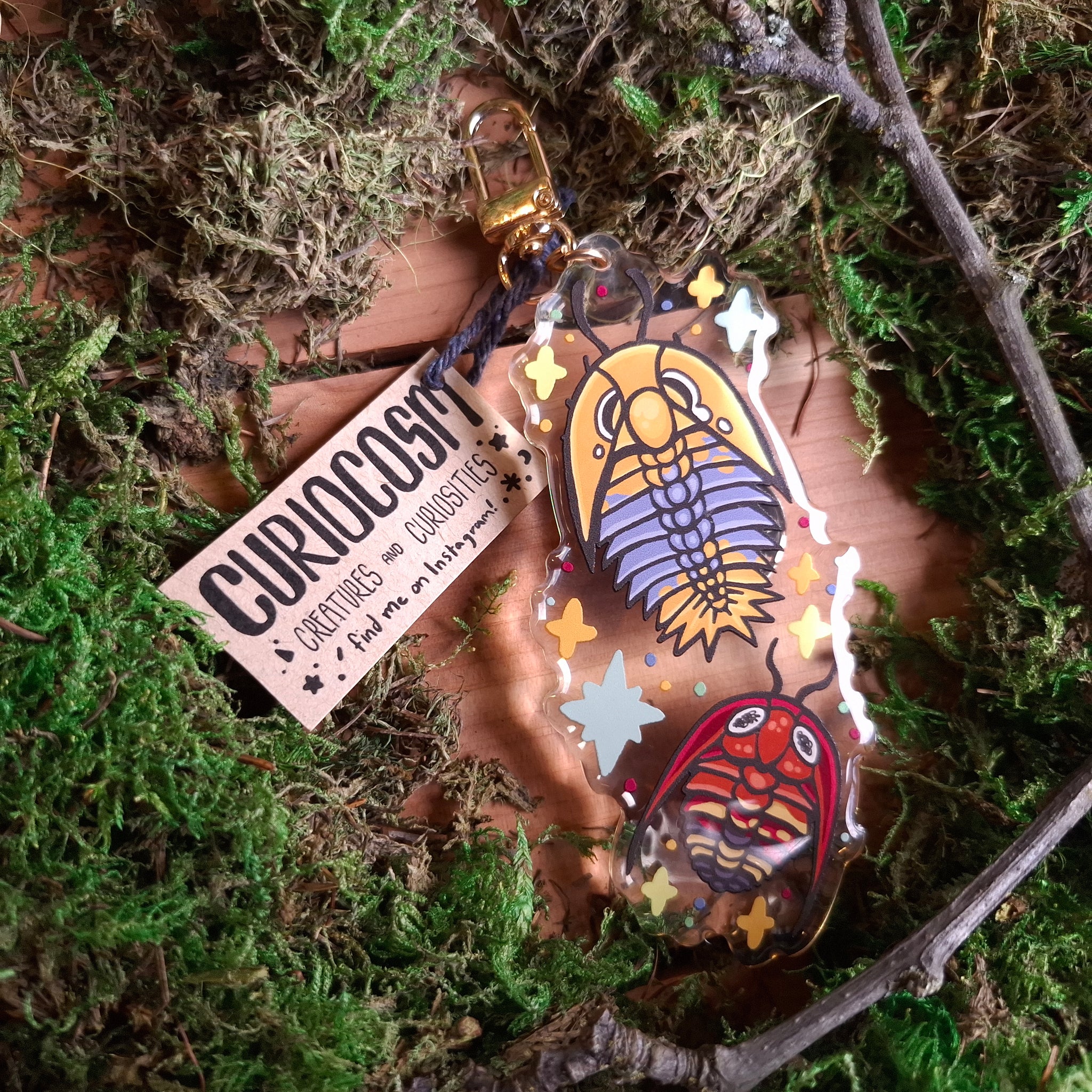 A double-sided keychain featuring some colorful trilobites. On one side they appear to be crying! I wonder why they're so anxious?