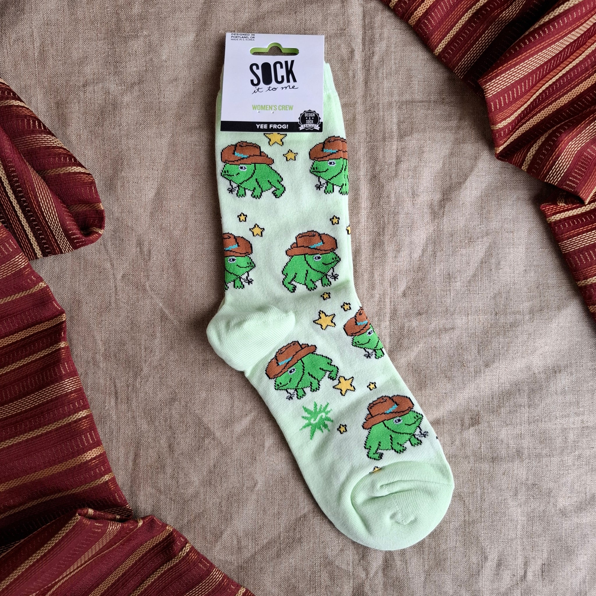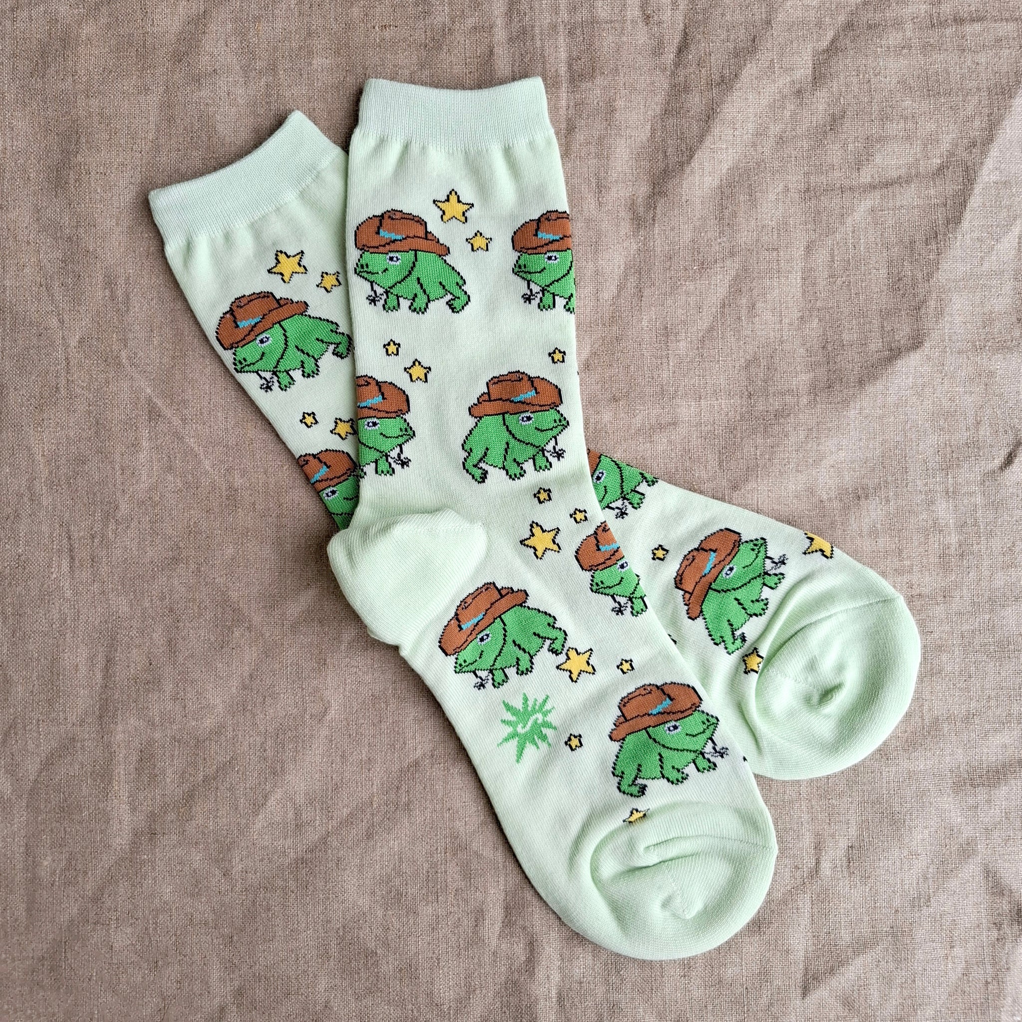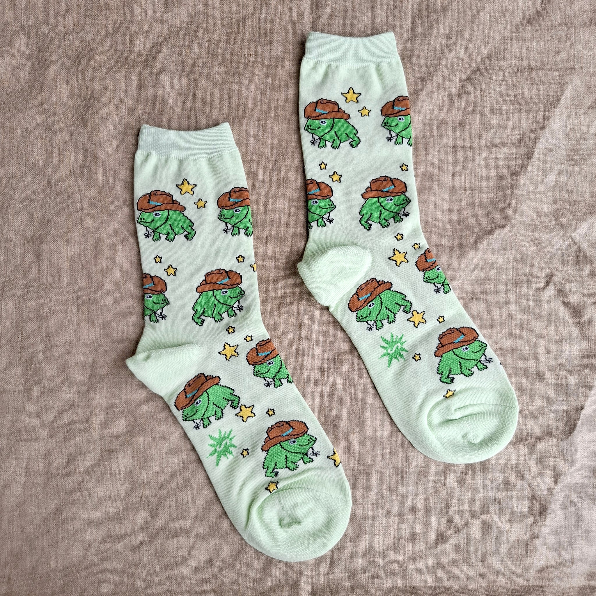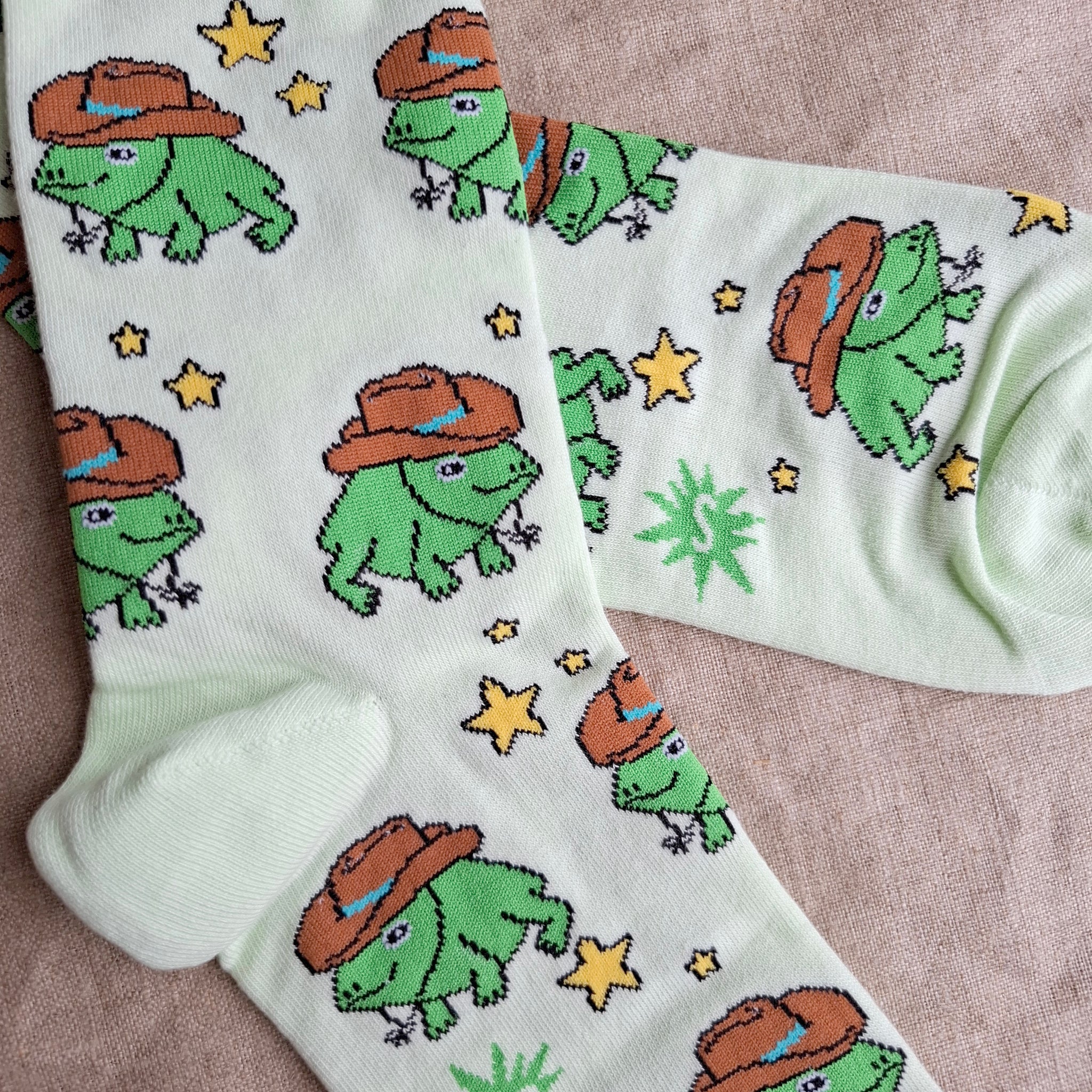 Get ready to rustle up some fun with our "Yee Frog!" socks, where every step is a wild west adventure! 🐸