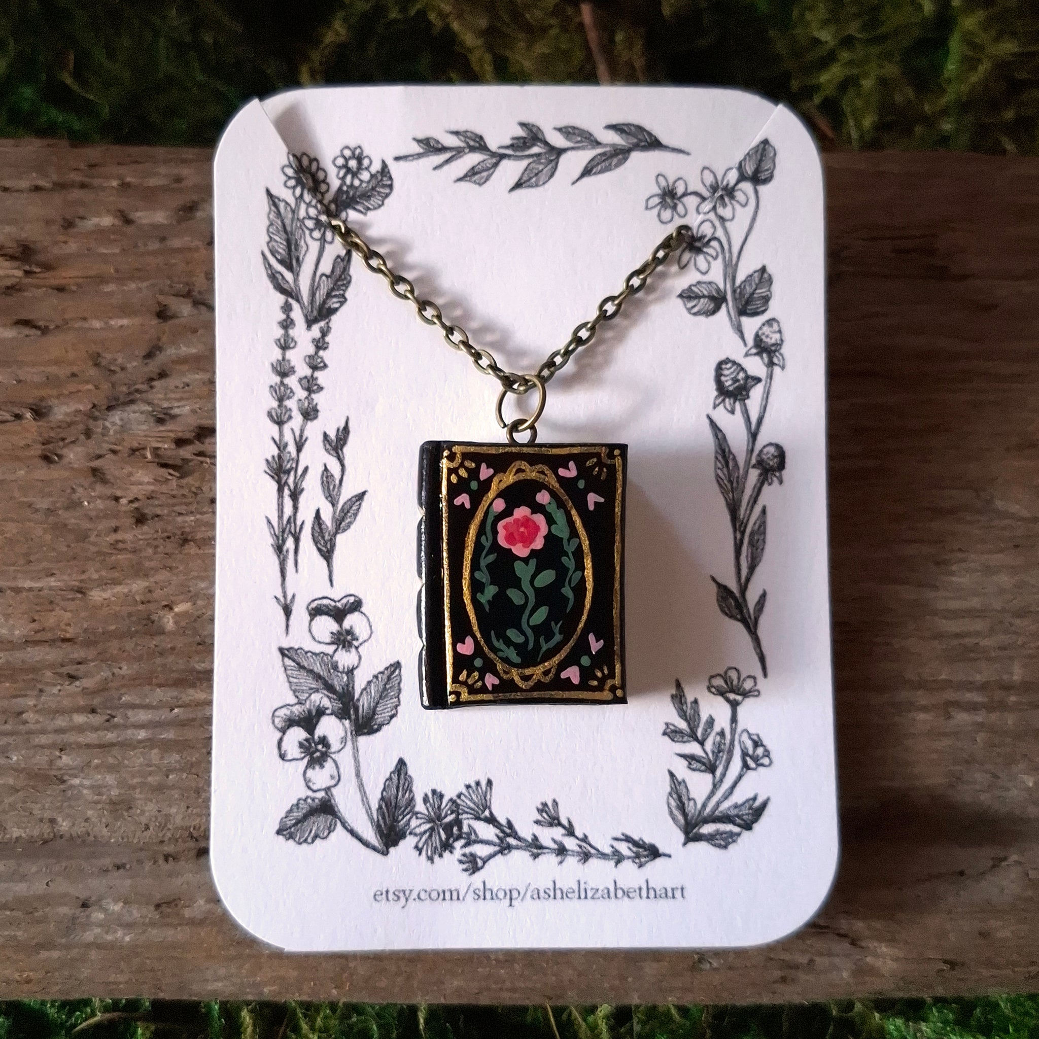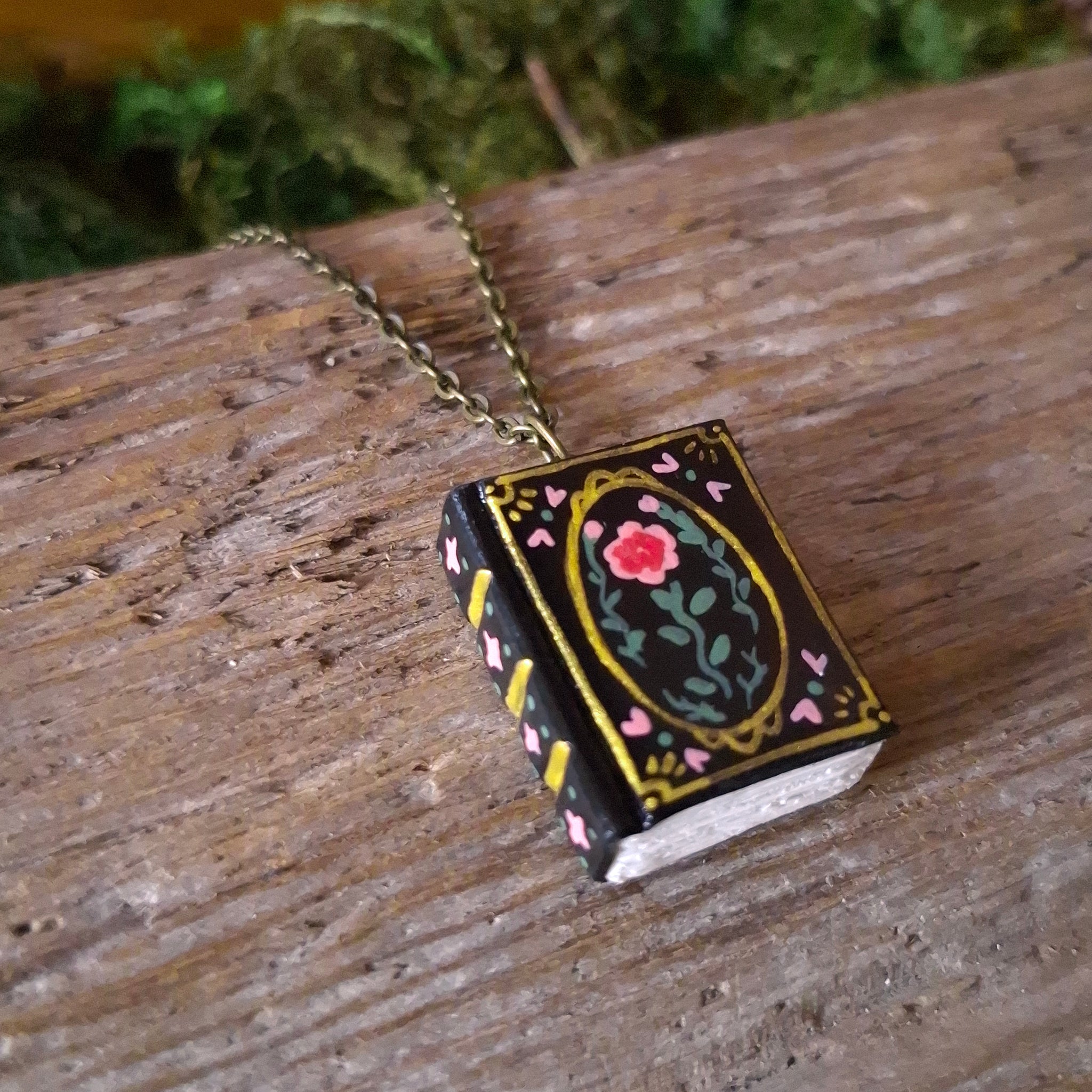 A dark and mystical book pendant, hand painted like a vintage hardback book with a romantic pink rose on the cover. A unique accessory for lovers of romance novels or dark academia. 🥀