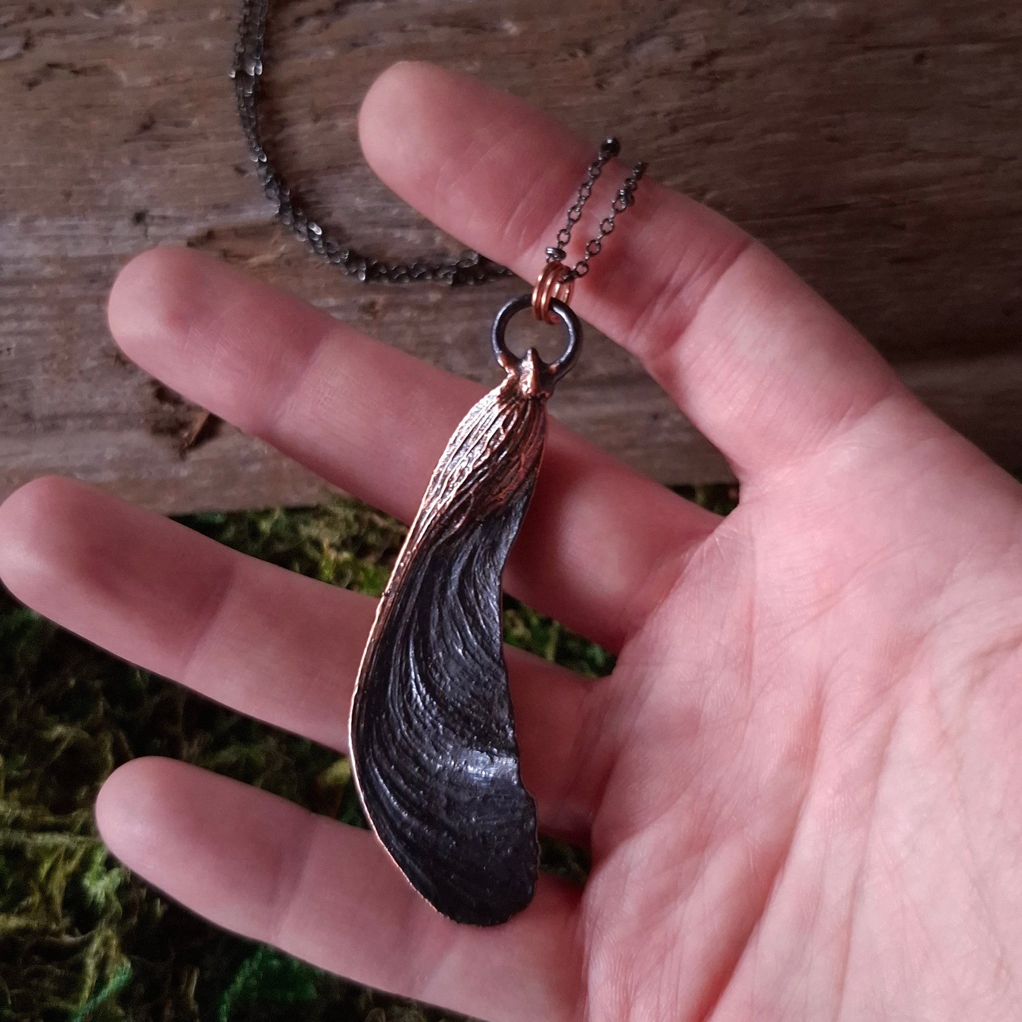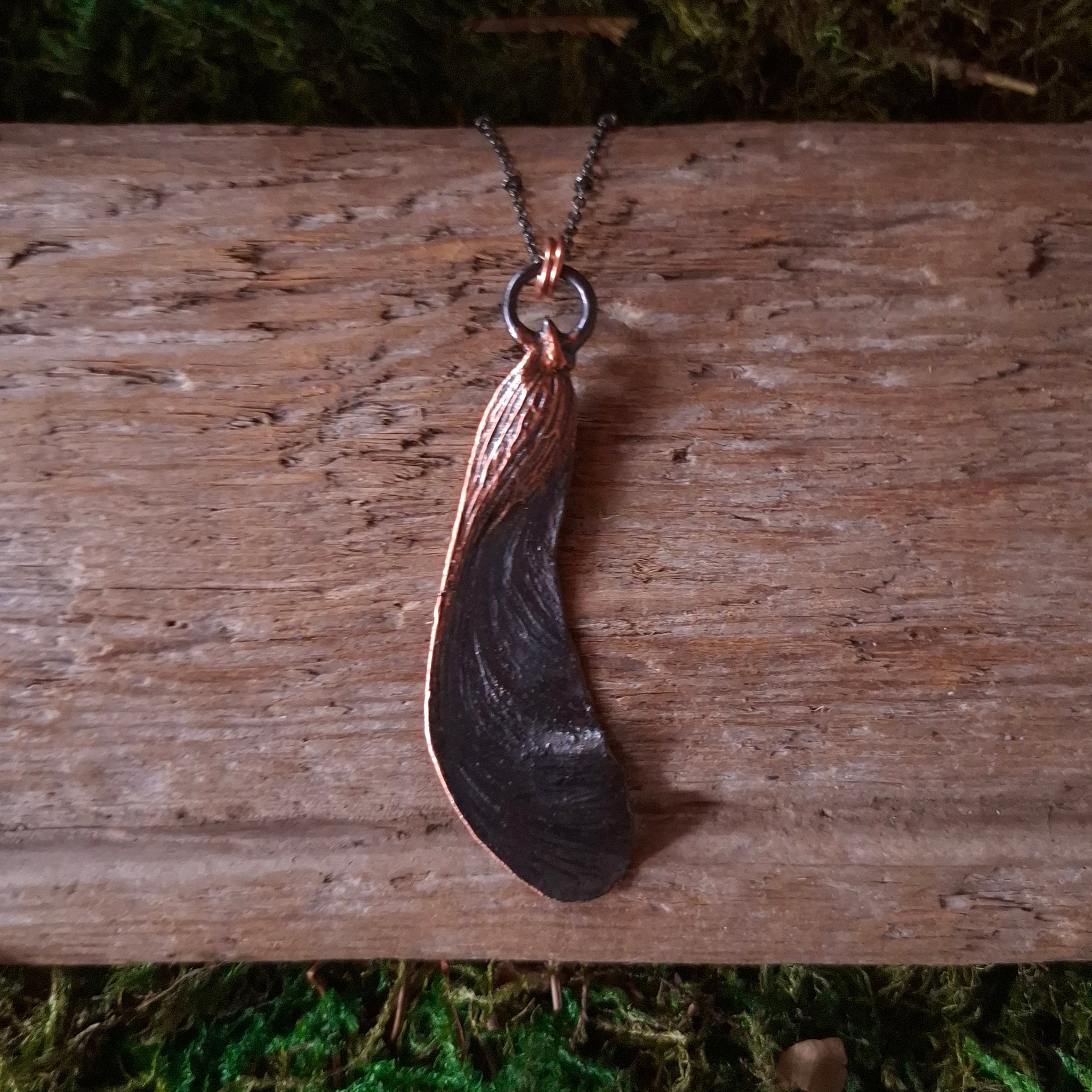 Copper-covered electroformed maple seed samsara, suspended from a long, black-toned copper chain.