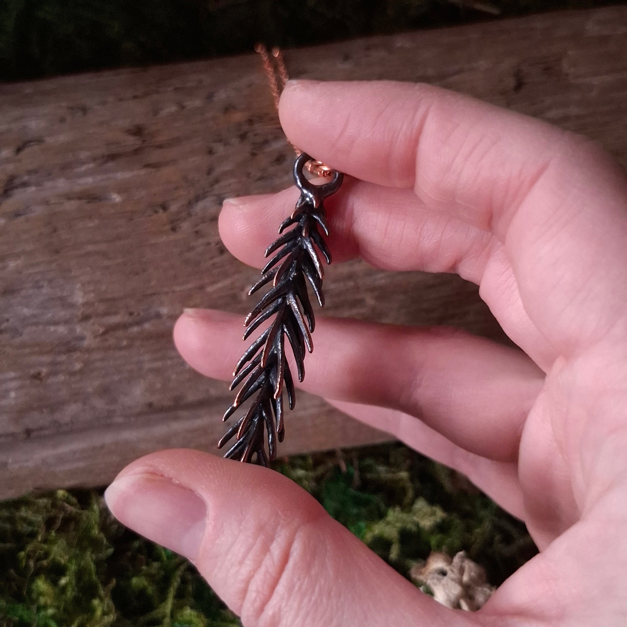 Copper-covered electroformed Japanese Cedar (or Sugi) sprig, suspended from a long, bright copper chain.