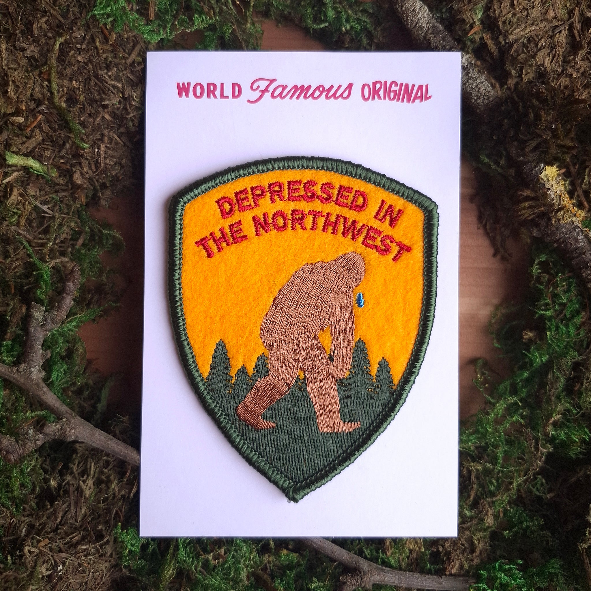 A badge-shaped iron-on patch, featuring a crying Bigfoot, with the text "Depressed in the Northwest". Brown, Red, and Green Embroidery on Gold Felt. Green Merrow Edge and an Iron-on backing.