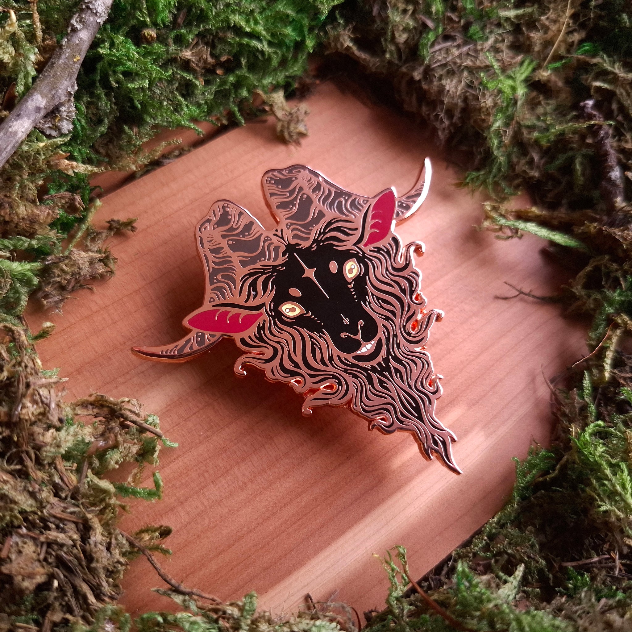 A bold enamel pin featuring the head of a black goat, with long twisting horns. 🖤