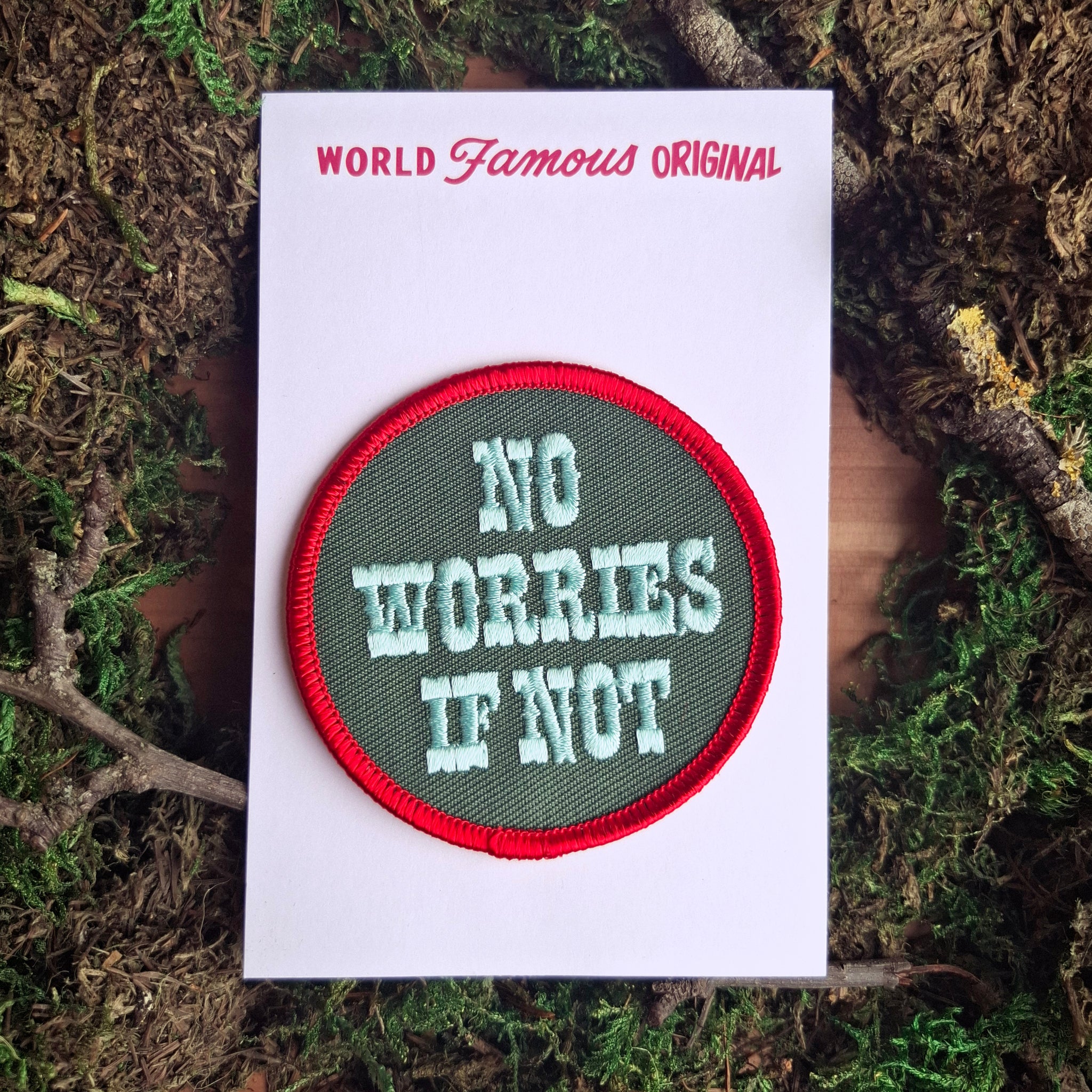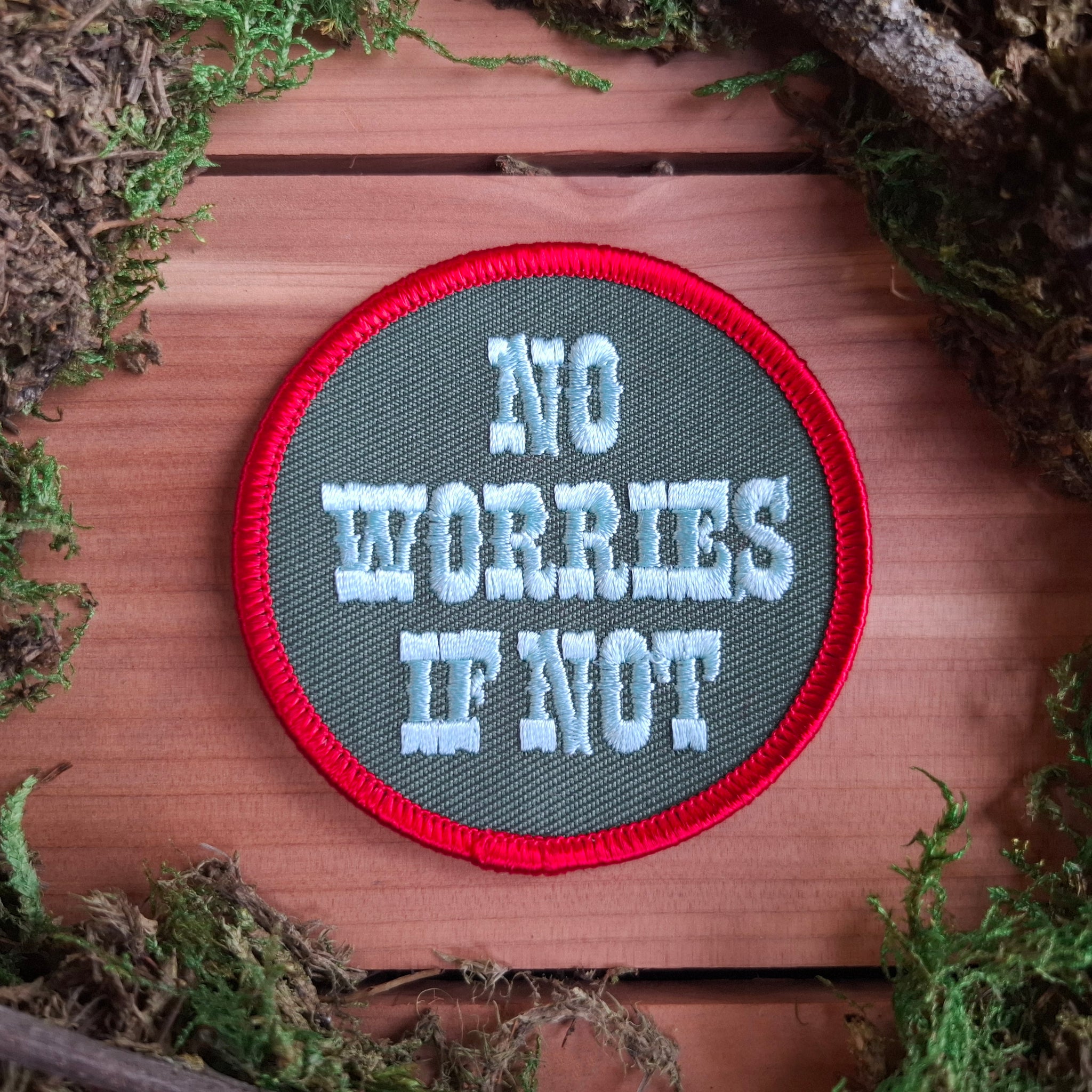 A round iron-on patch, with the bold text "No Worries if Not". Brown, Mint embroidery on forest green twill. Red Merrow Edge and an Iron-on backing.