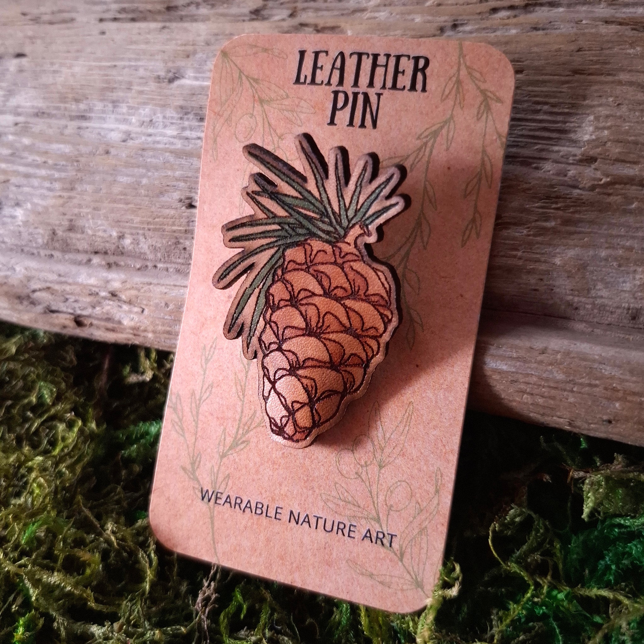 A detailed brooch of a pine cone, with some green pine needles peeking at the top. This pin is designed from the artist's original ink drawing, then transferred to leather.