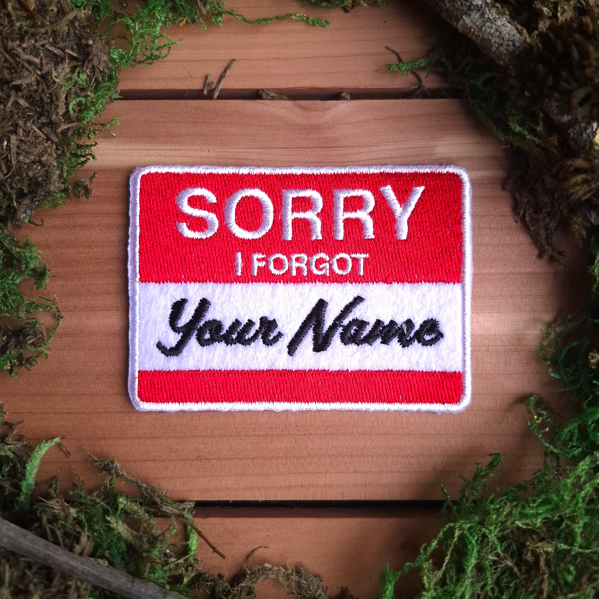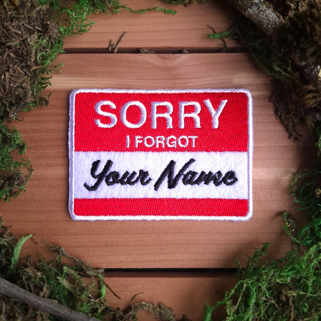 A high-quality embroidered patch in the style of a nametag, that reads "Sorry / I forgot / Your Name". Red, Black, and White embroidery on white felt.