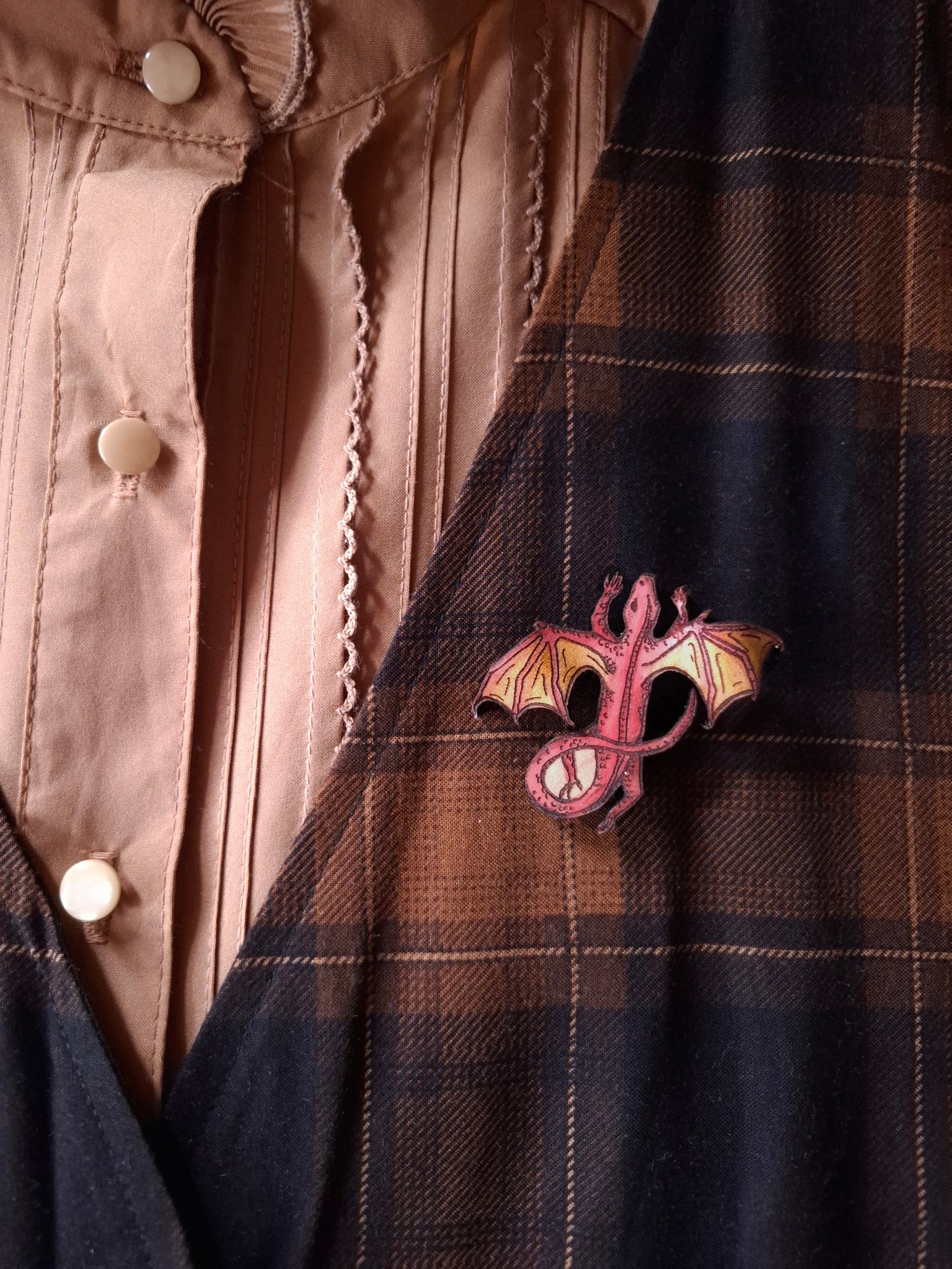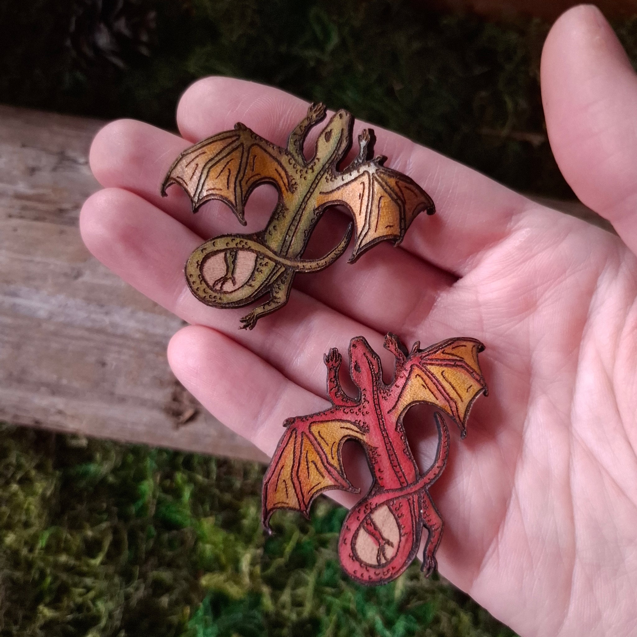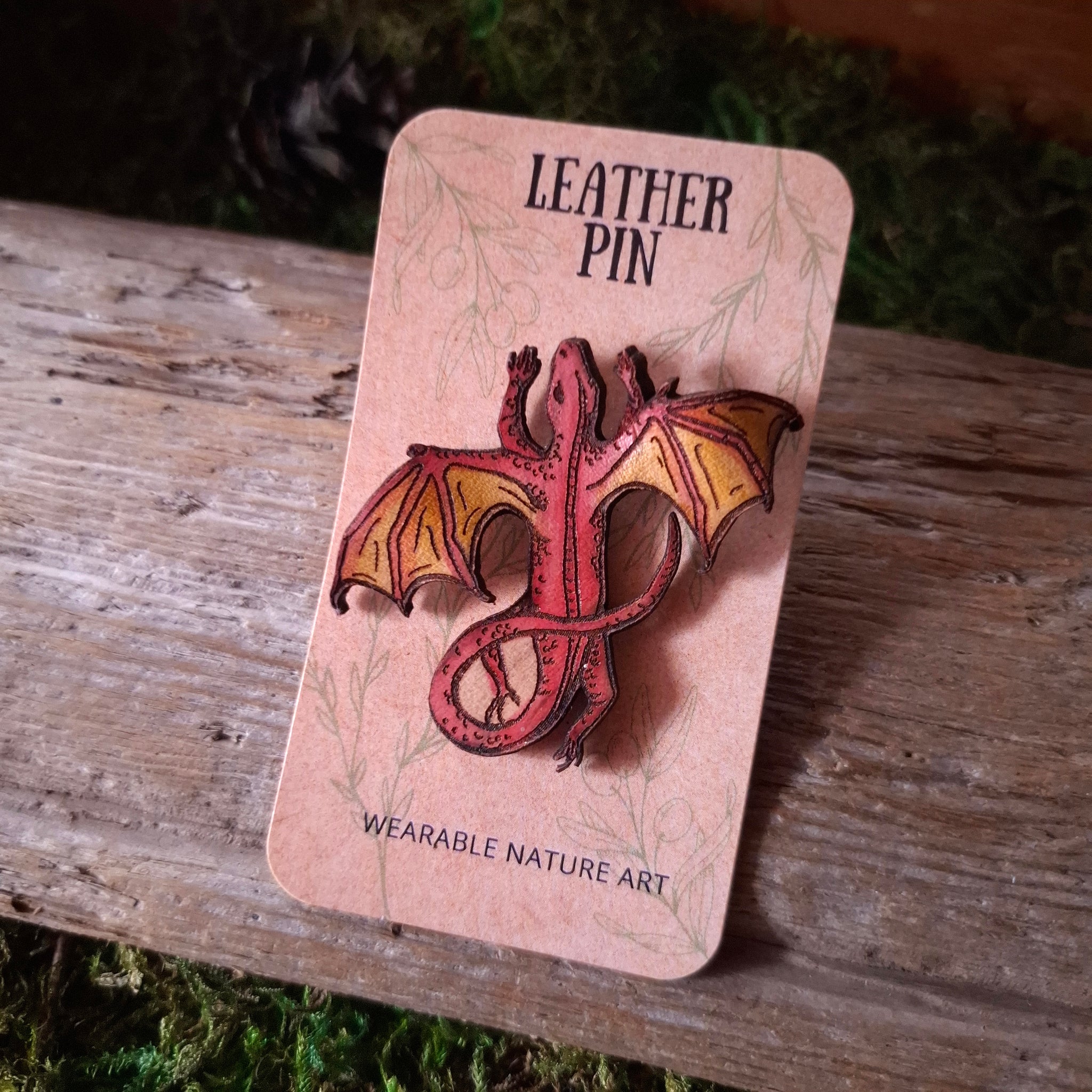 From nature to fantasy, who doesn't imagine having a tiny flying lizard dragon as a pet? This leather pin is designed from the artist's original ink drawing, then transferred to leather.