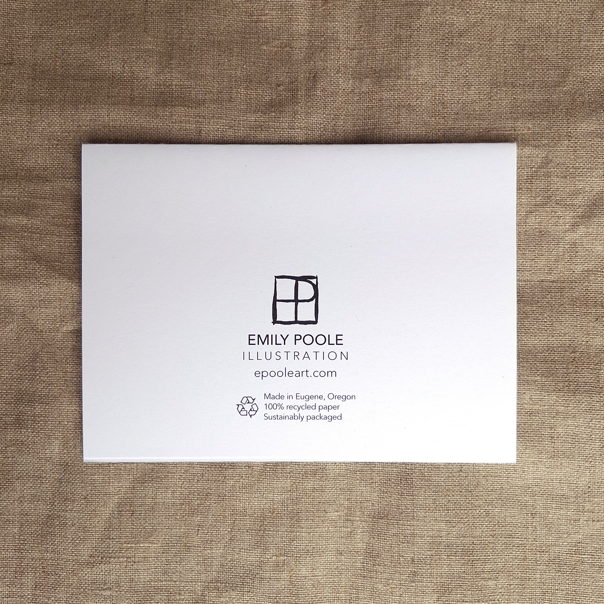 These greeting cards feature high-quality prints of ink and watercolor illustrations. They are blank inside to deliver sentiments for all occasions. Individually packaged cards come in a protective sleeve that is 100% biodegradable and compostable.