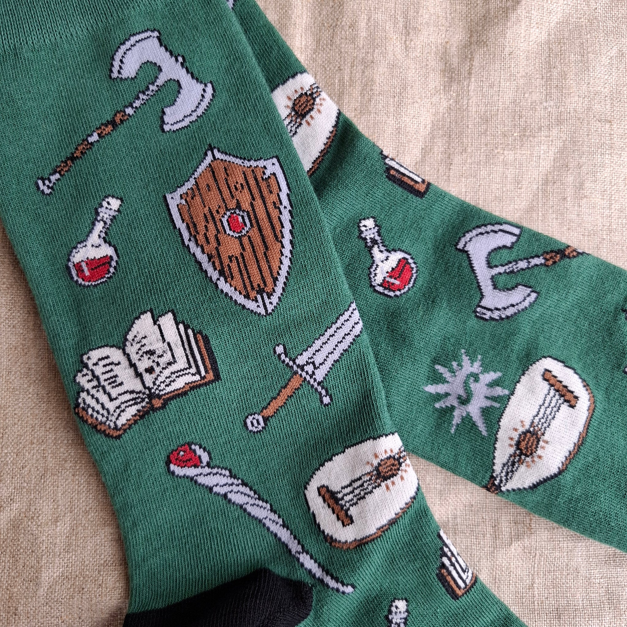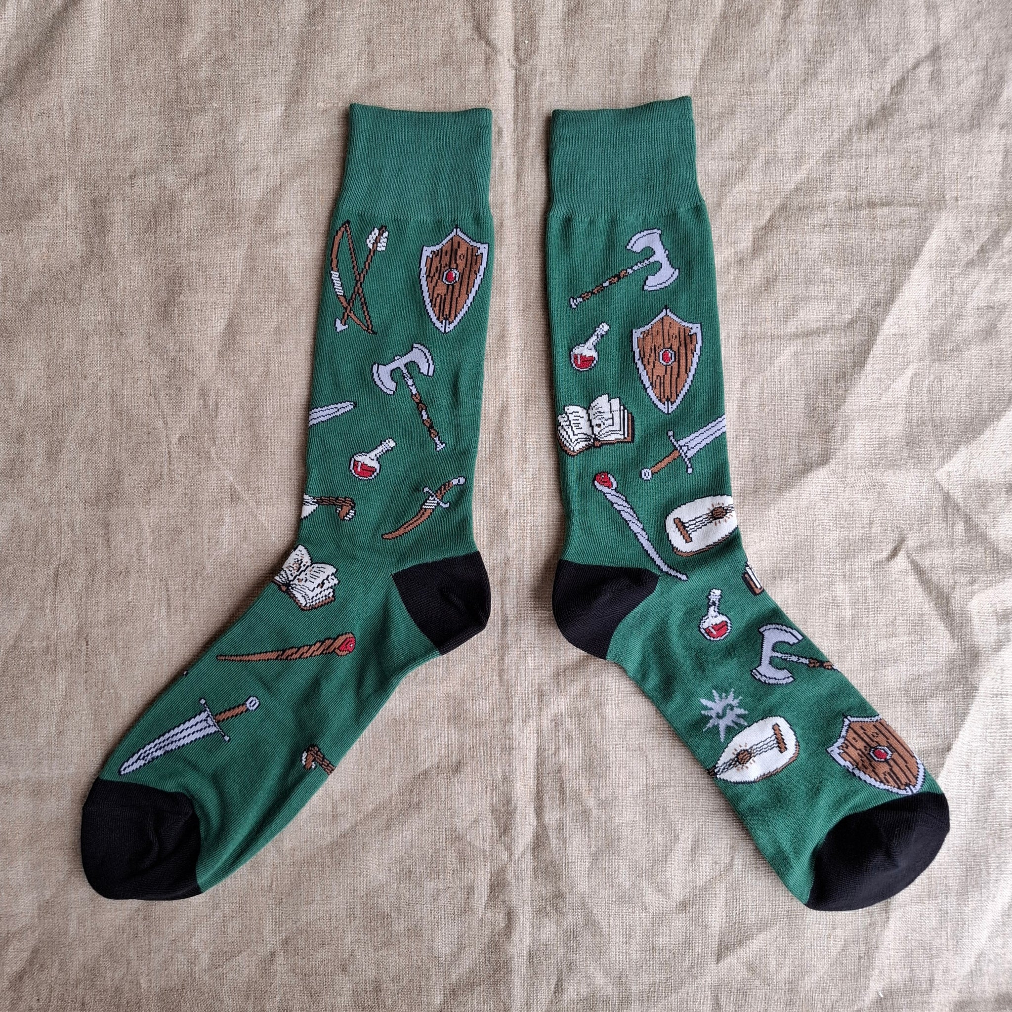 Green colored socks with an assortment of DnD weapons; swords, shields, axes, lutes! And a couple potions, of course. ⚔