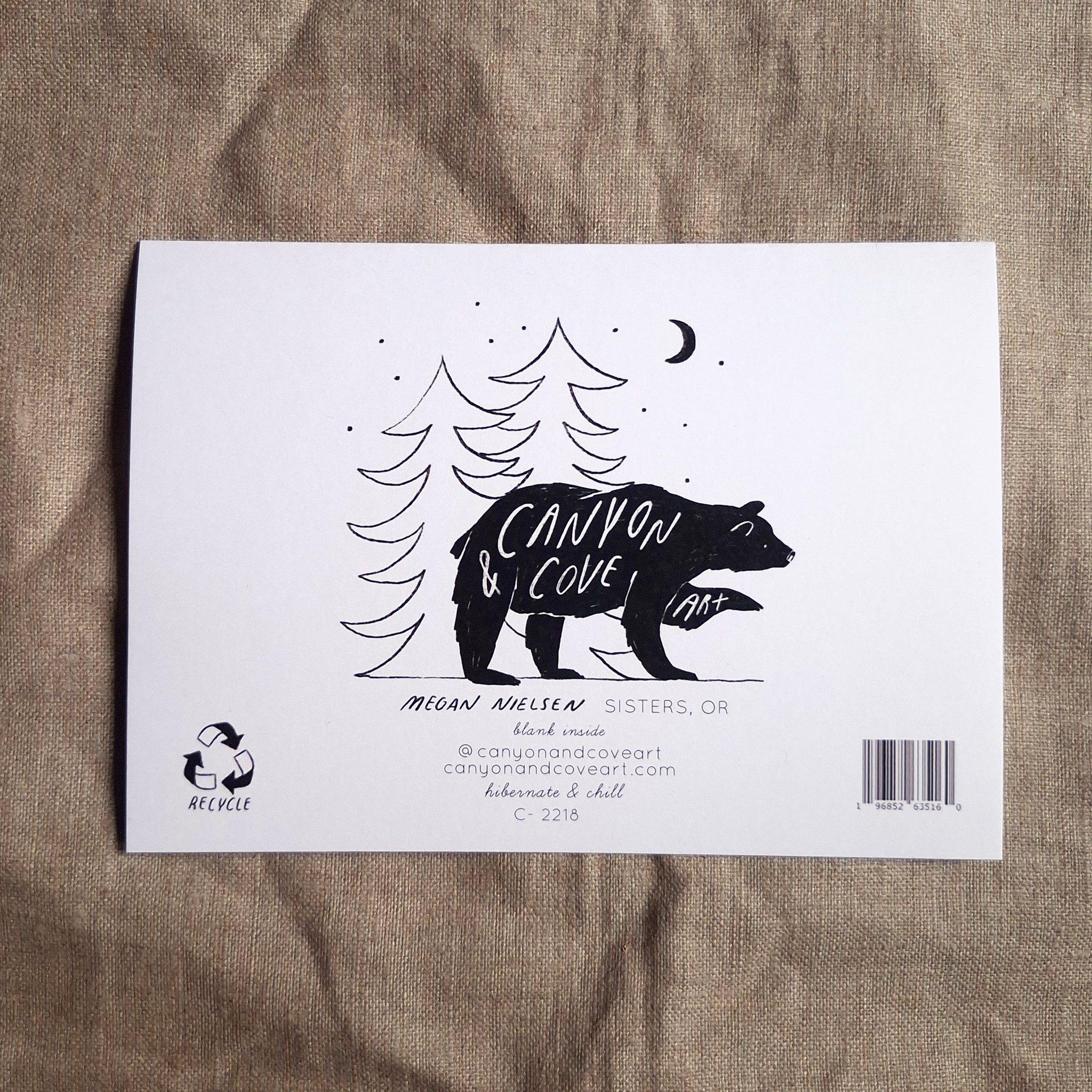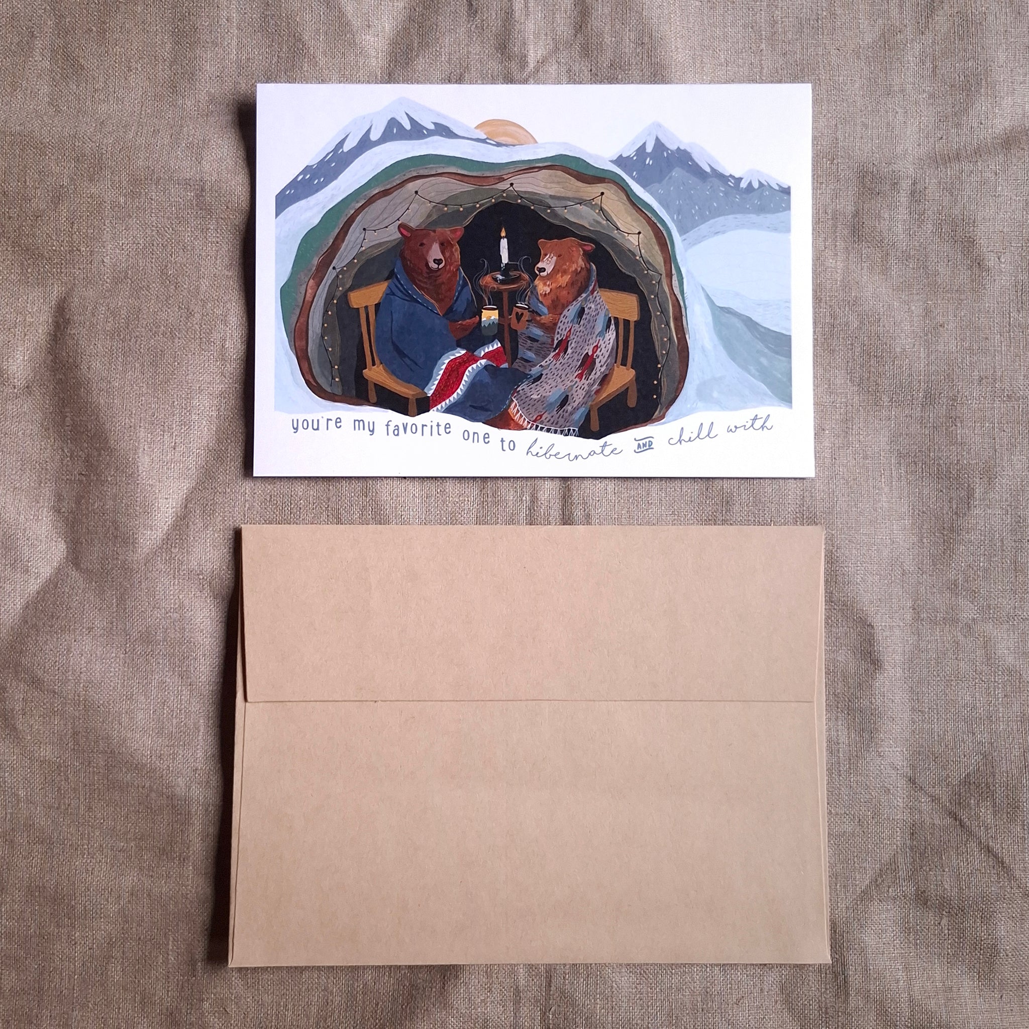 This greeting card features two cozy brown bears snuggling by candlelight in their mountainside cave. These cute friends are perfect for the Holidays, Valentines Day, a loved one's birthday, or an anniversary.