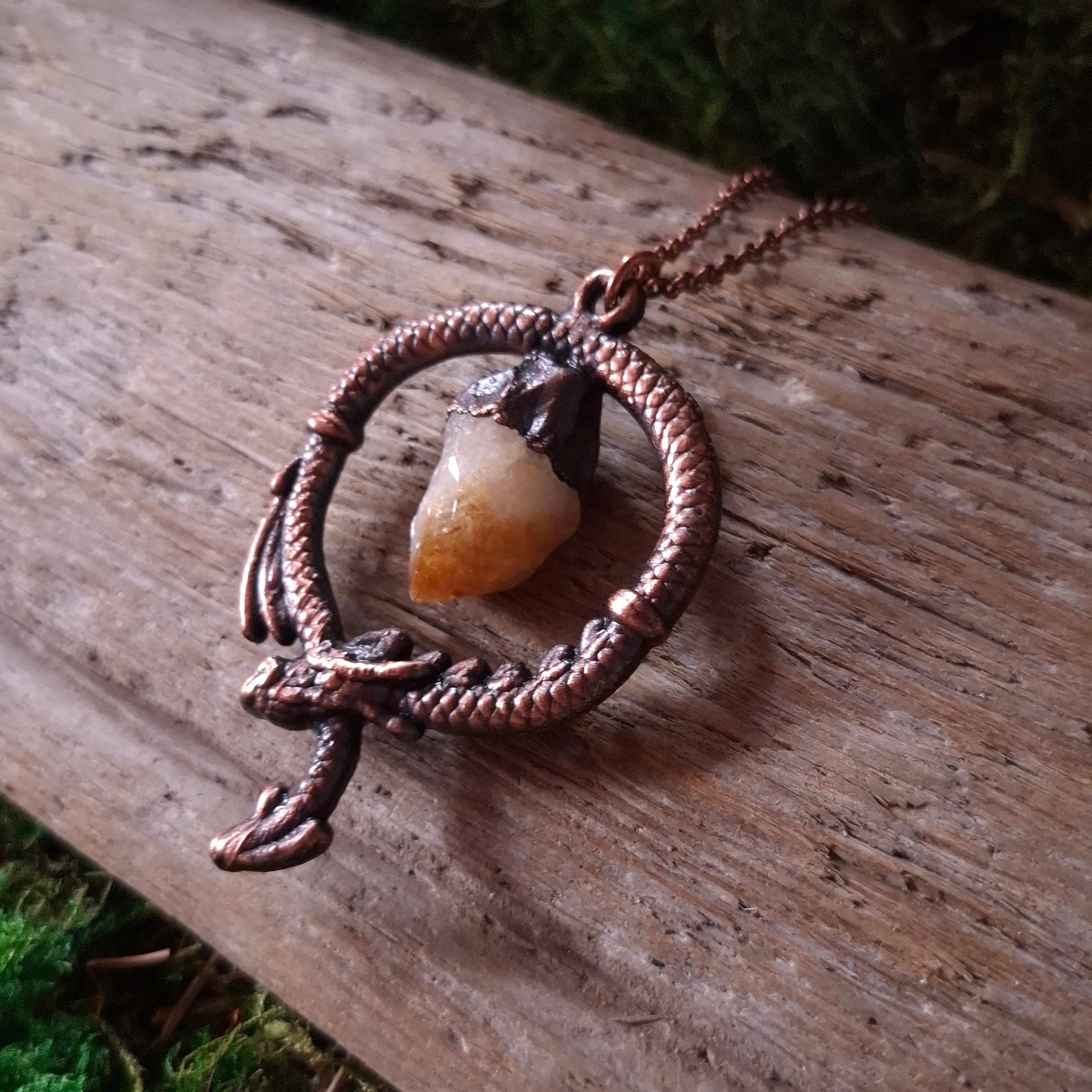 A mystical dragon-shaped pendant, made from electroformed copper, with a citrine crystal suspended in the center, like a dragon guarding its hoard.