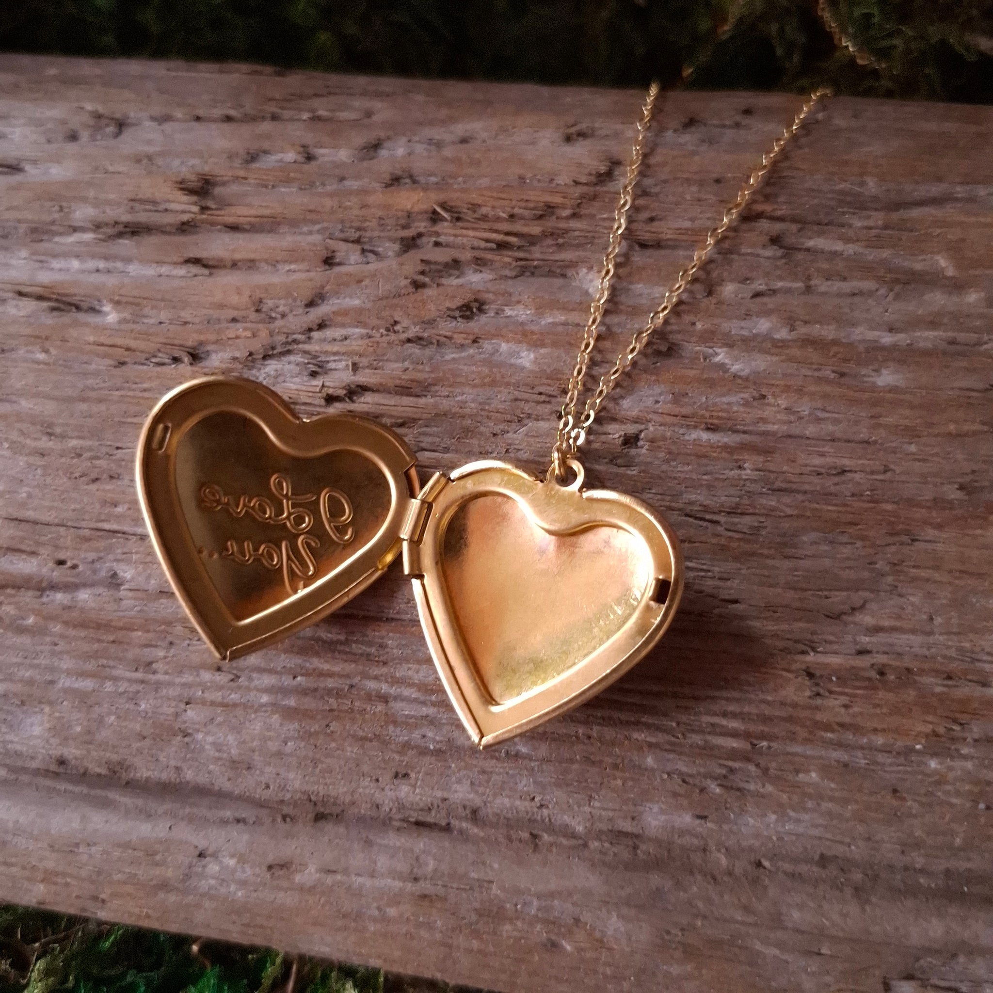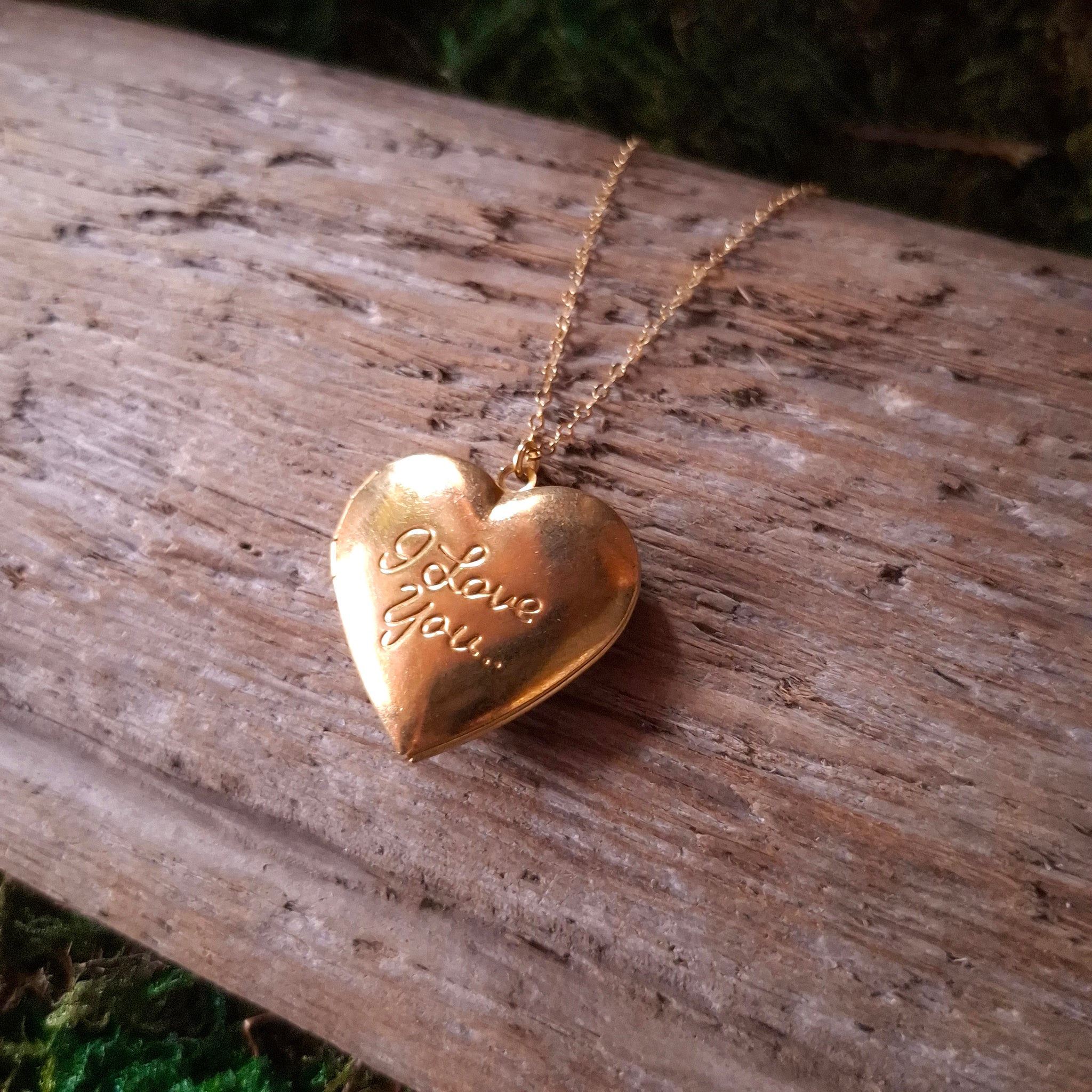 A deadstock vintage heart-shaped locket with “I Love You” in cursive text embossed on the front. The locket opens at the side.