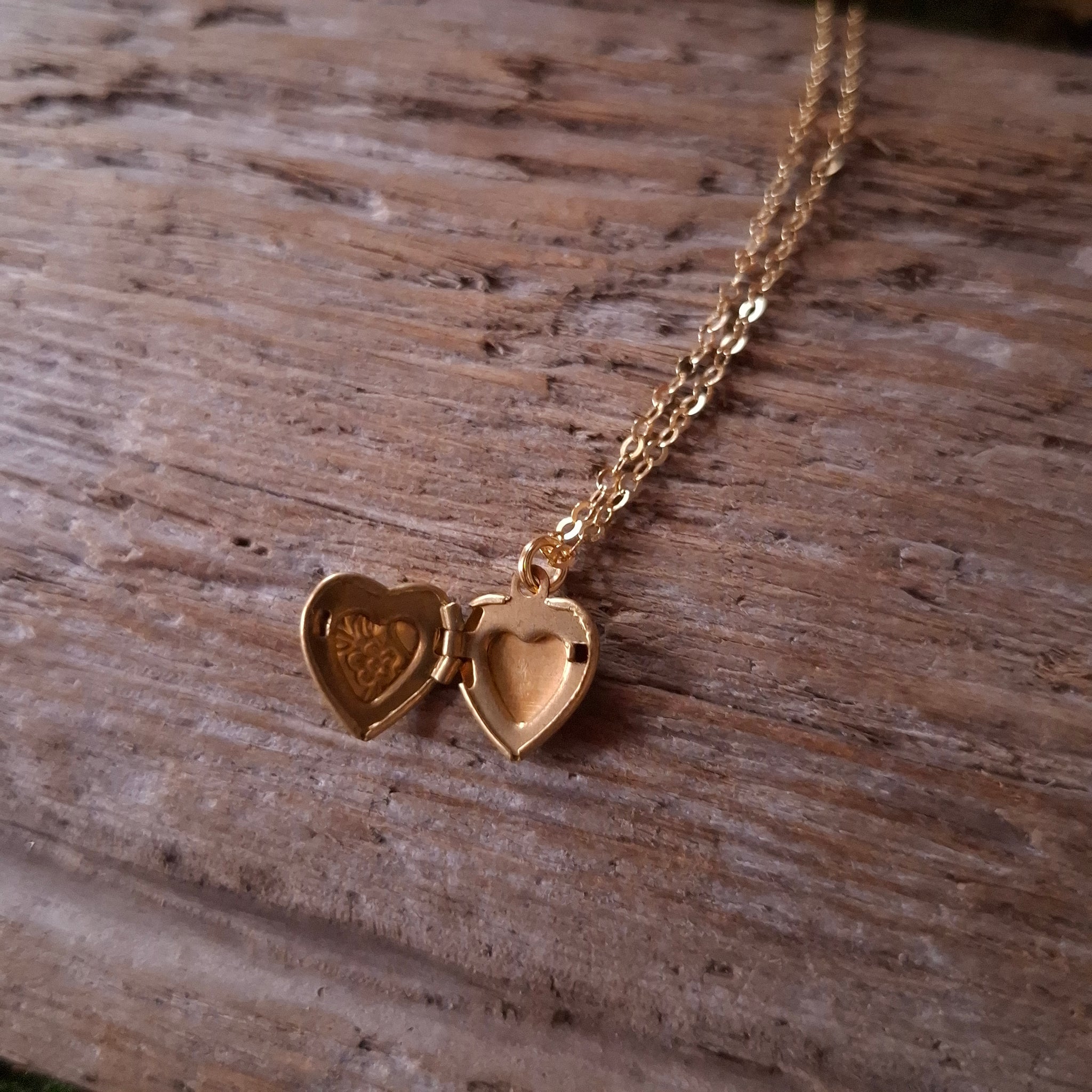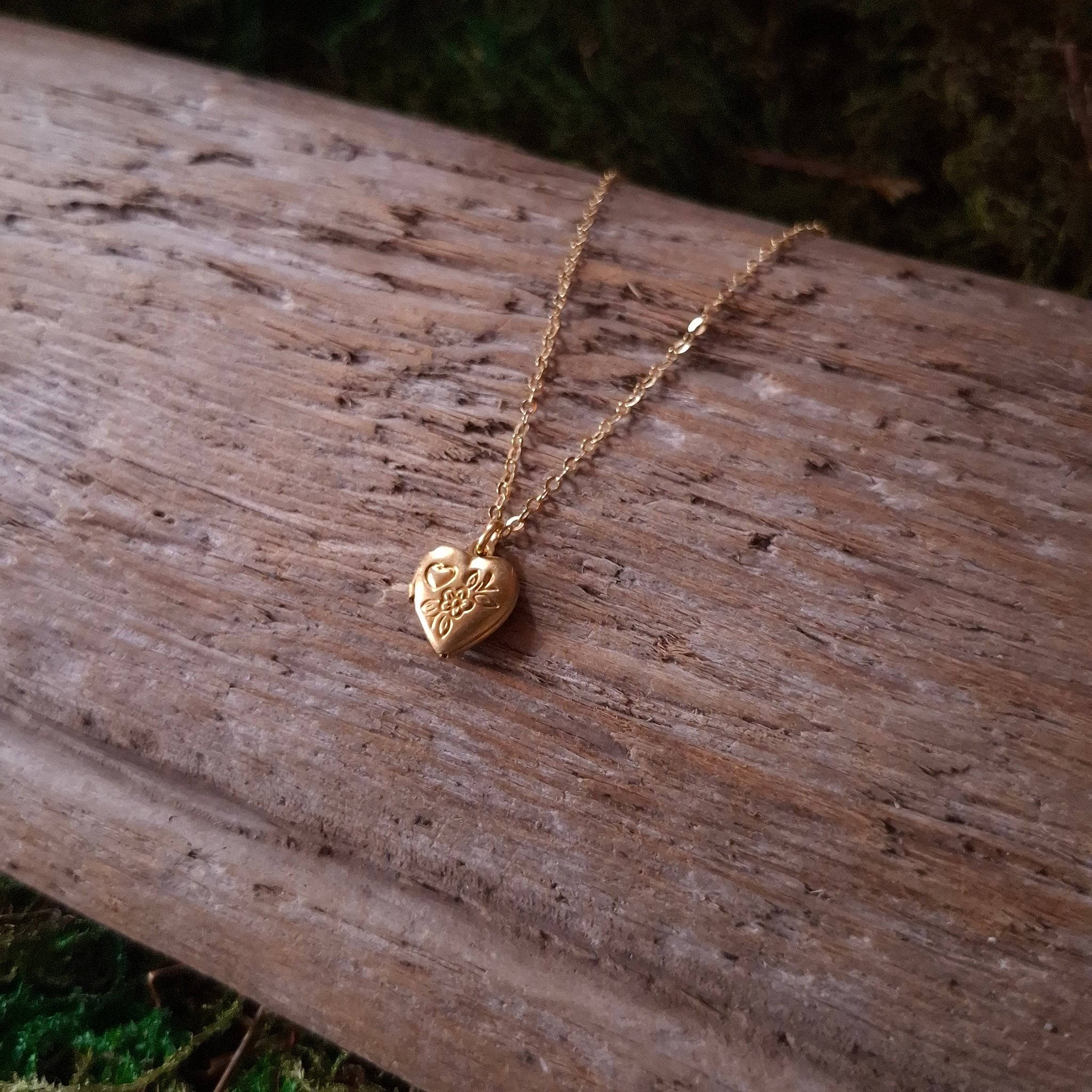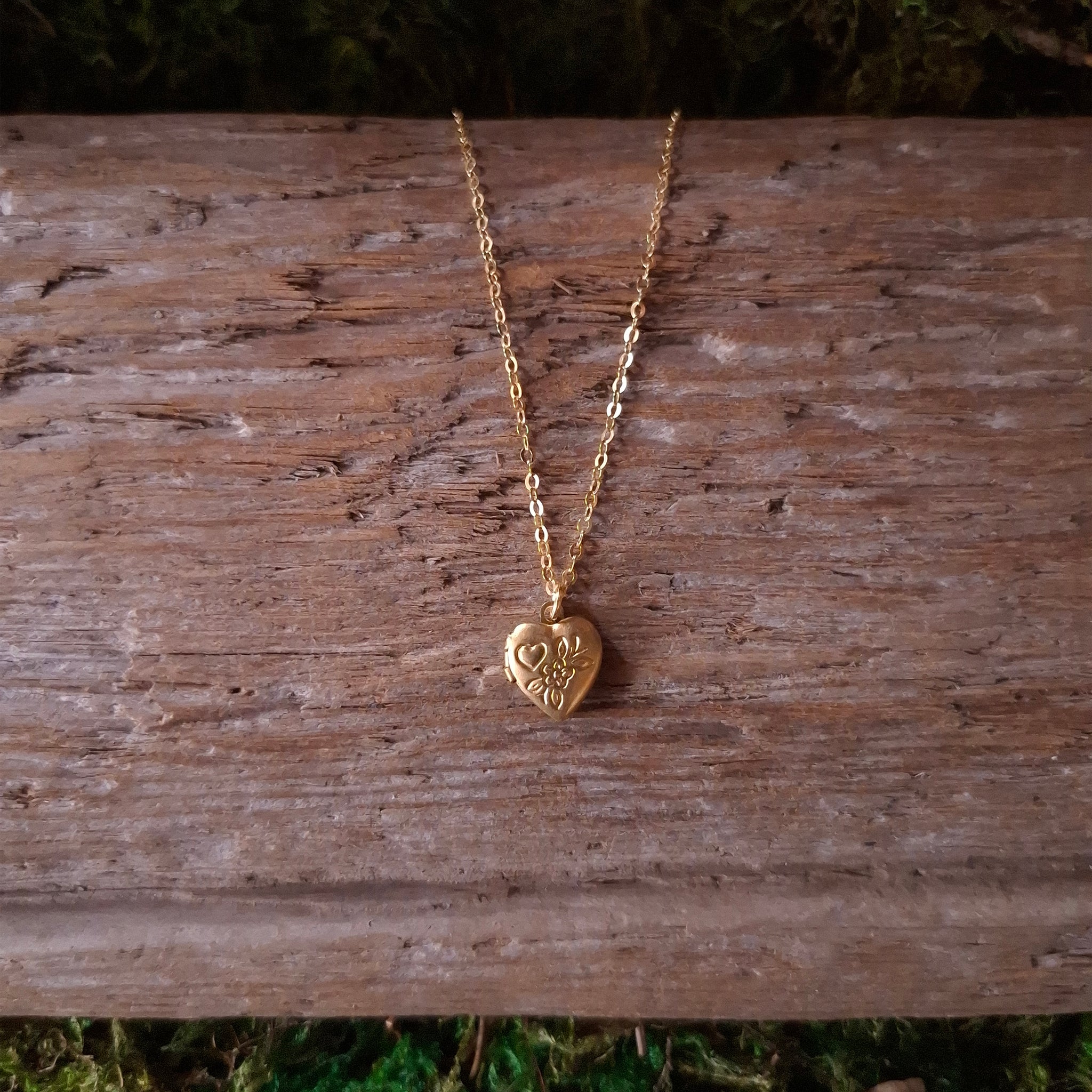 A deadstock vintage, tiny heart-shaped locket, embossed with a floral design on the front. The locket opens at the side.