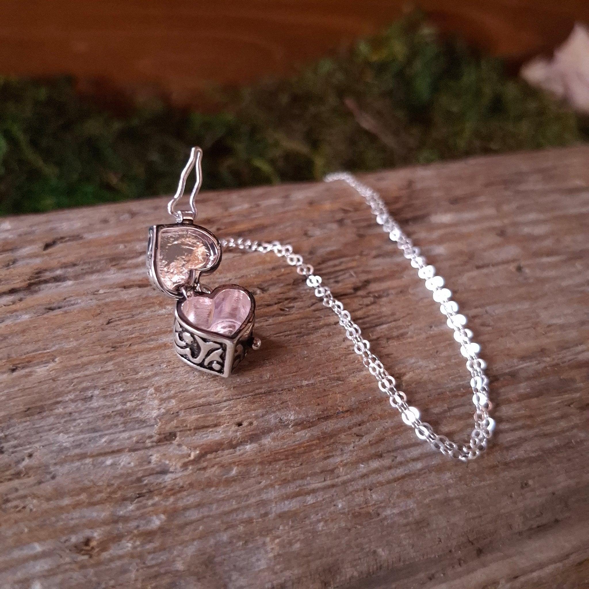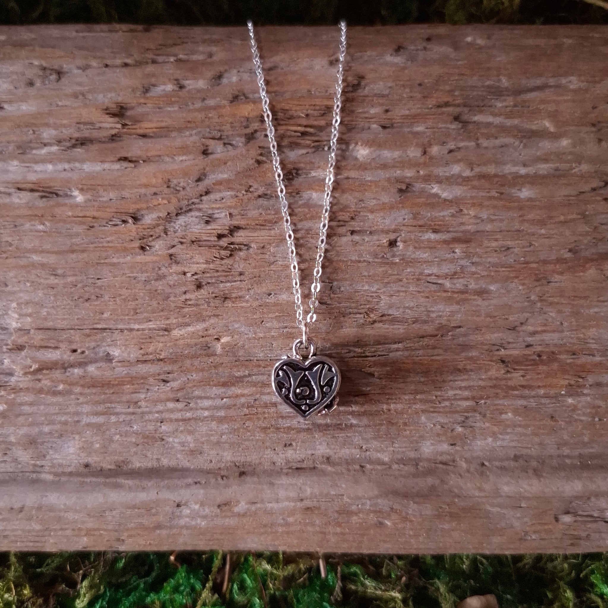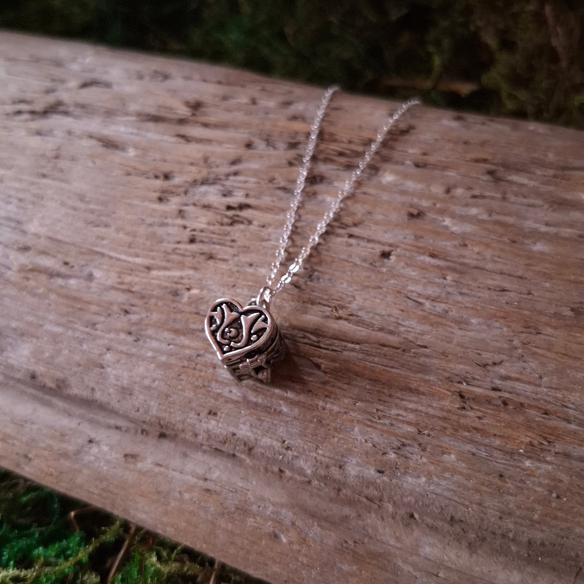 A deadstock vintage, small heart shaped box pendant, with a lovely filigree style design. Comes on a 100% recycled sterling silver cable chain. The box opens at the top, and has a clasp to keep it closed.