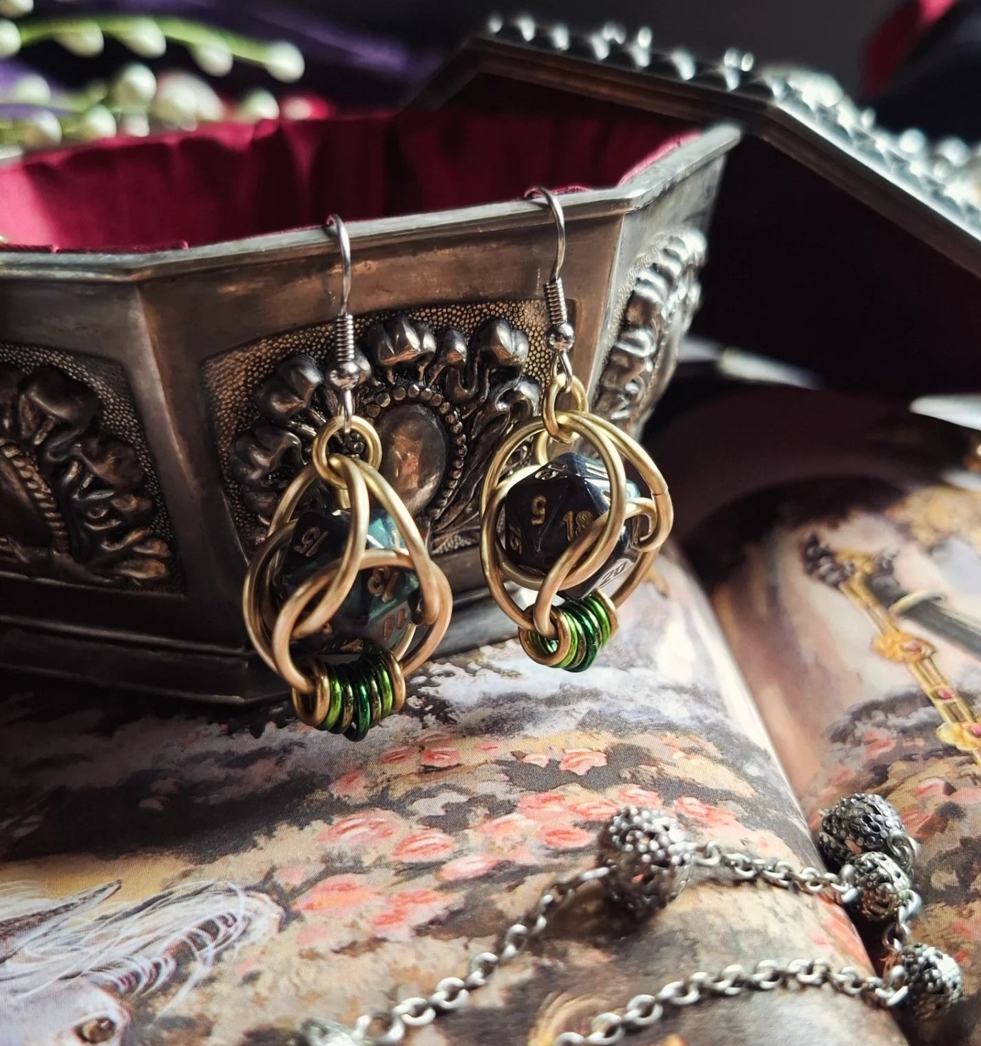 These elegantly geeky earrings feature miniature deep green marbled 20-sided dice, encaged in light gold-color chainmail links. Lightweight and comfortable enough for all-day wear, they're the perfect accessory for gamers, dice collectors, and anyone who wants to add a touch of woodland fantasy to their style.