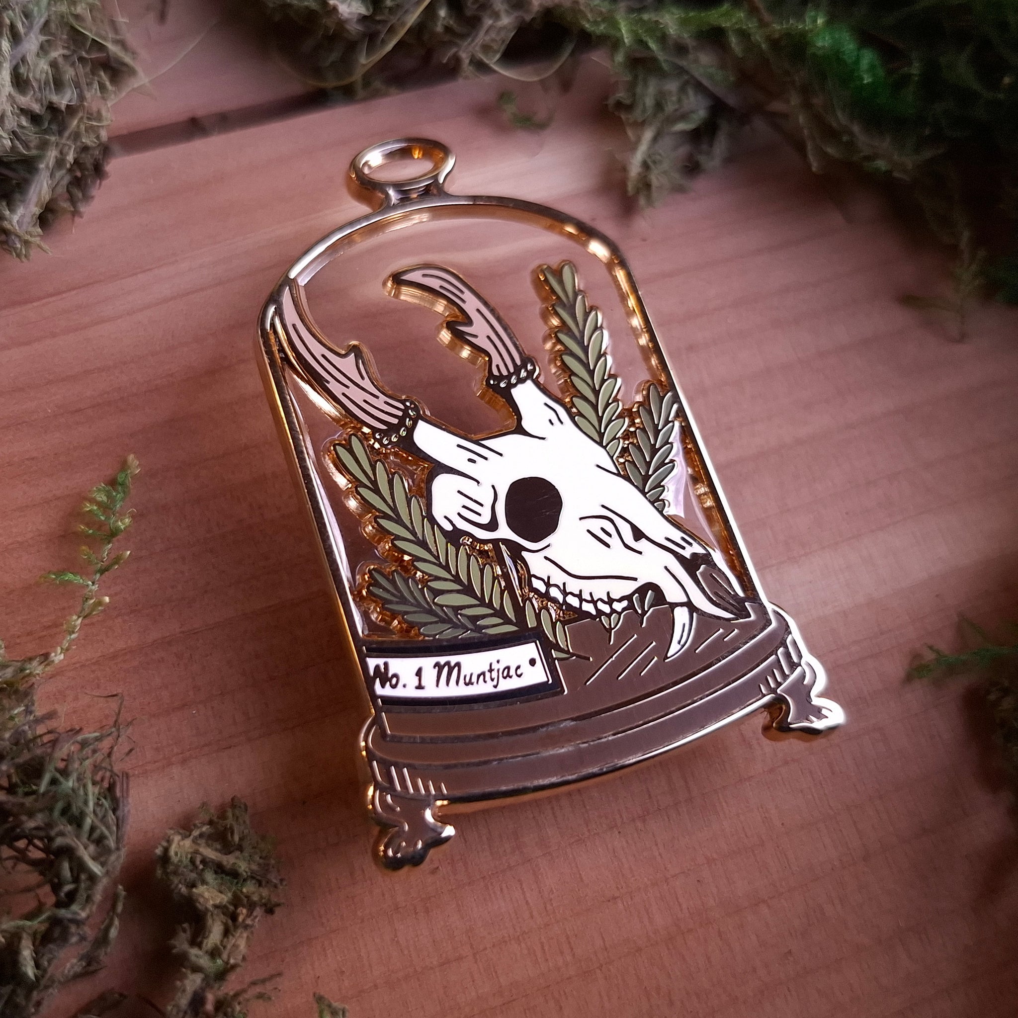 A curious enamel pin featuring a muntjac skull displayed underneath a glass cloche. The muntjac is also known as the "barking deer", and has elongated canines that look like fangs!