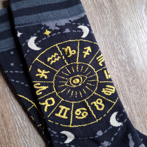 Crew length socks with astrology symbols printed on one side. Black, with metallic gold accents.