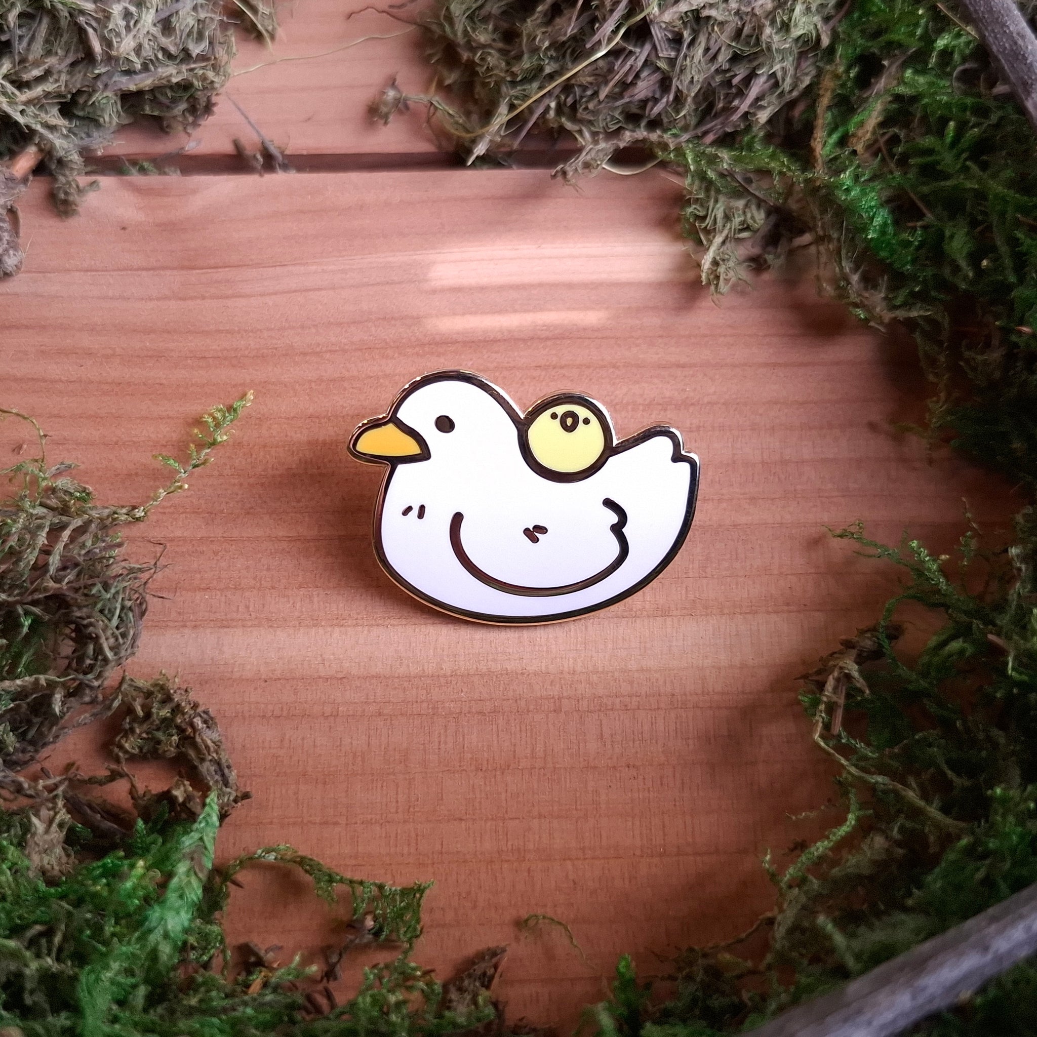 A cute round duck, with a somehow even rounder duckling on its back! 🦆